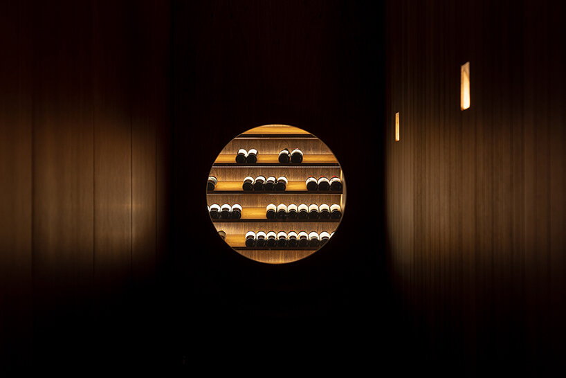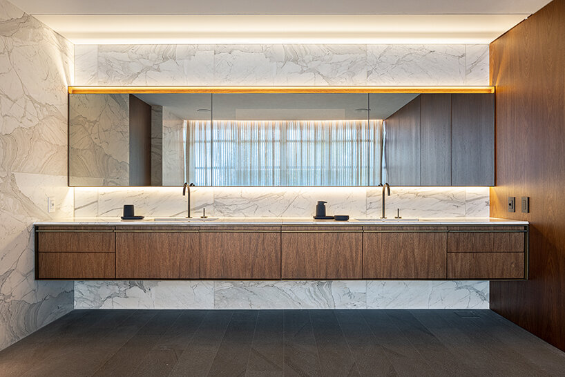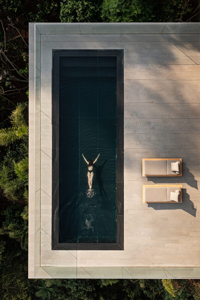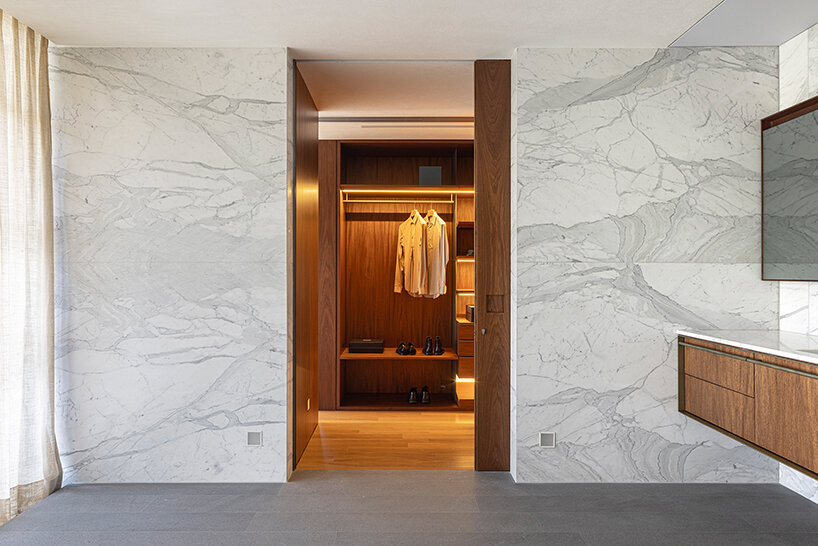 At the edge of the living room, pivoting wooden panels open towards the west terrace, with a platform serving as an observation deck and a sun-lit pool with two tanning beds. ‘In this residential space, all functions are covered to make day-to-day living possible, but contemplation and pondering over the passage of time are at the very center of its essence,’ continues Studio MK27 (see more here).