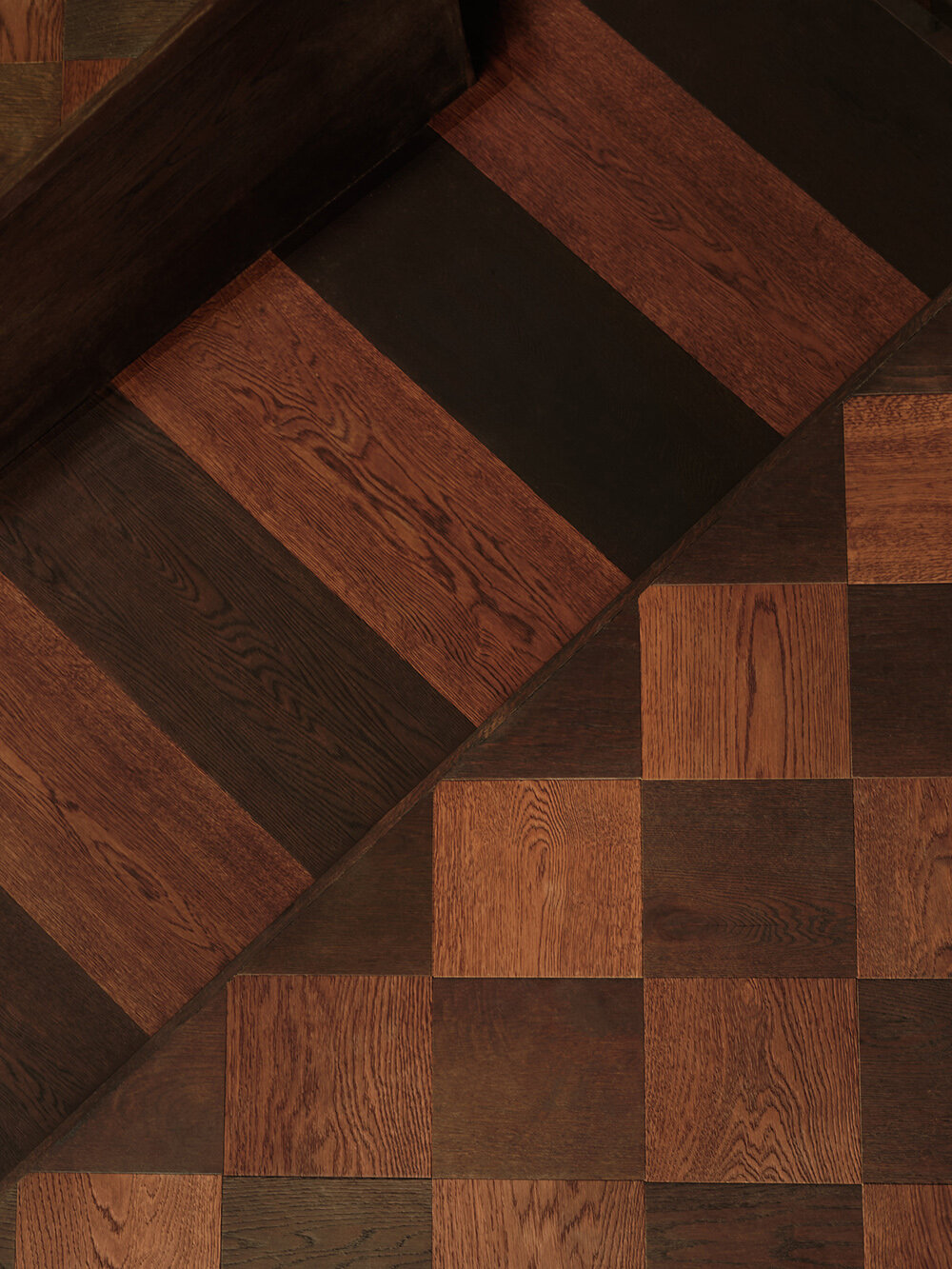 These lights consist of layers of bronze mirrors, lights, and glass panels that allude to the protective screens used during experiments. The long bench opposite features integrated lighting under the leather backrests, reflecting the speckled tiles and glass paneling above it – another reference to the old school. Wooden hanging lights provide further illumination in this area. The shape of these strip lights recalls the laboratory test tubes and come in three dynamic forms: with the oak part on top; in the middle; or at the bottom. Furniture-wise, Studio Modijefsky combined reclaimed vintaged chairs with custom-made tables (round and square, made with two types of wood with different edgings and interiors).