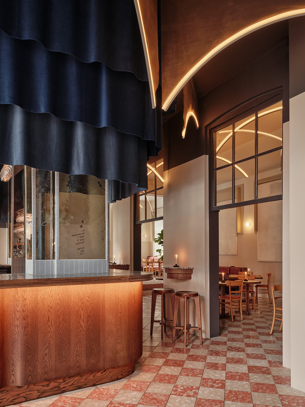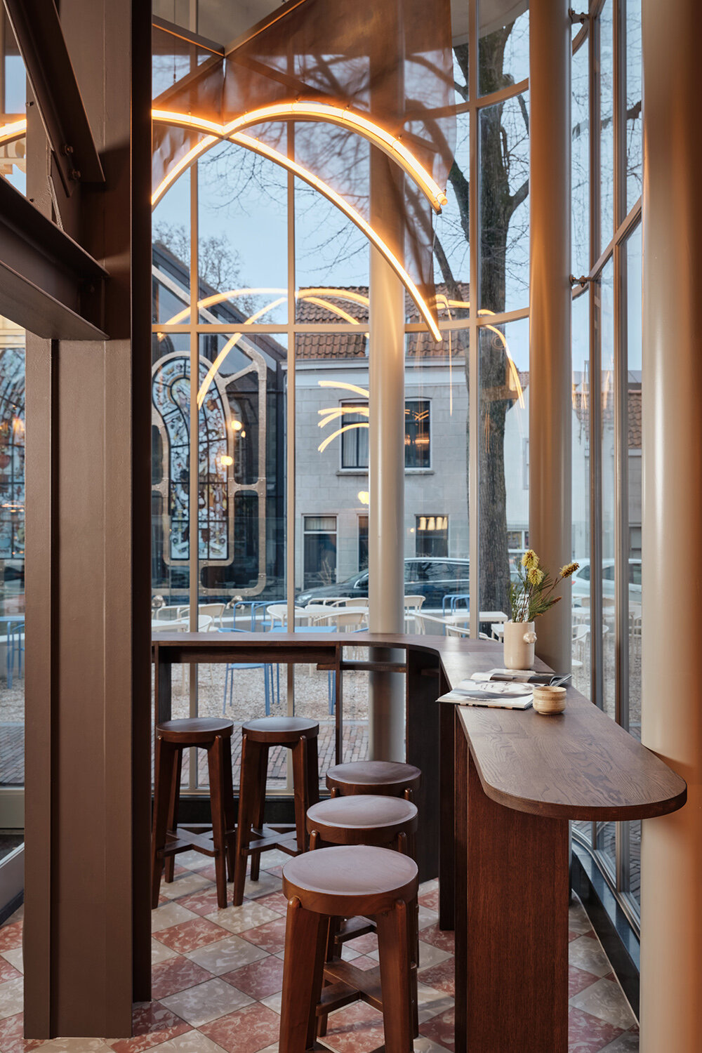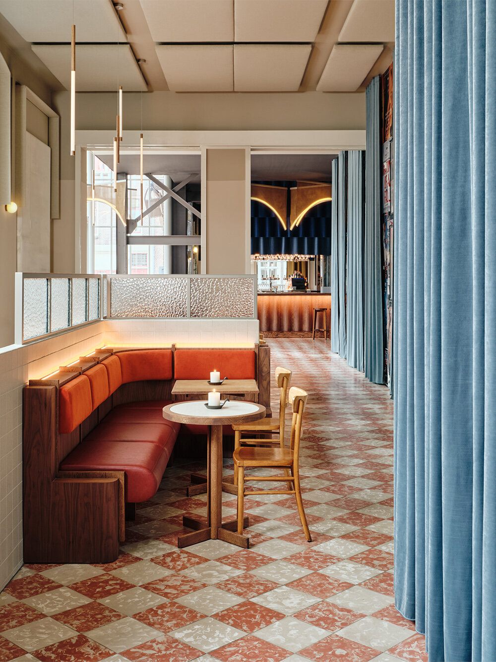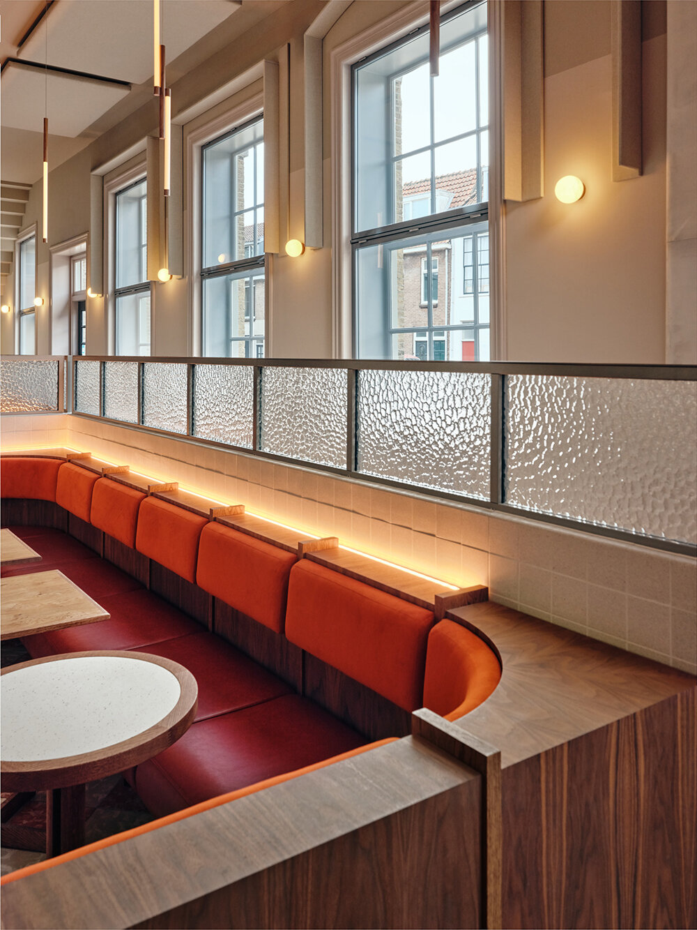 Two parts of the De Witt brasserie are elevated to play with height: one corner that looks out of the high windows and the central space opposite the kitchen. They both stand on a warm-colored, chess-patterned stone floor clad in Aigües tiles handmade in Mallorca. The elevated parts are differentiated by an alternative floor pattern with squares instead of diagonals. Seating in the three smaller areas is provided by custom benches in the same shade of vermillion as in the main brasserie but with leather backrests and seats. The presence of the school is felt in the wooden divisions that demarcate where one should sit – however, nobody will mind if you break the rules here. The seating’s rounded edge details where the bench meets the wall indicate the softening of etiquette. Windows in these spaces and throughout the ground floor feature wimple frames inspired by the nuns’ head covering, made of thick dark linen and a warmer shade of grey.