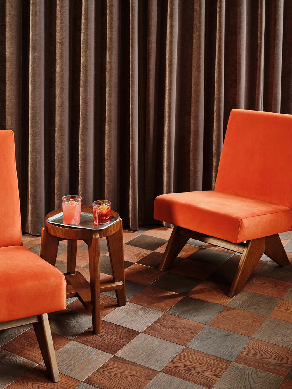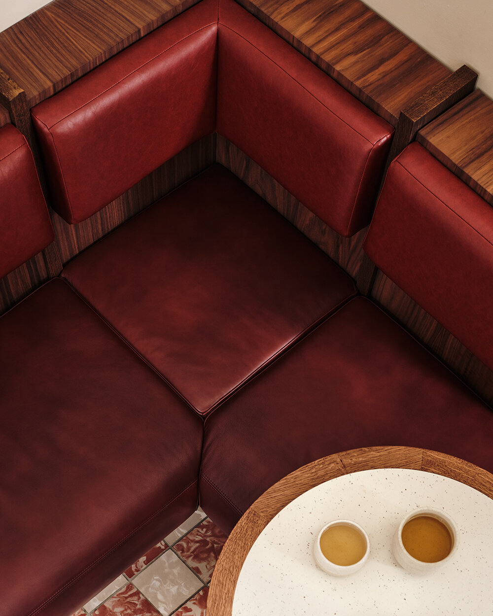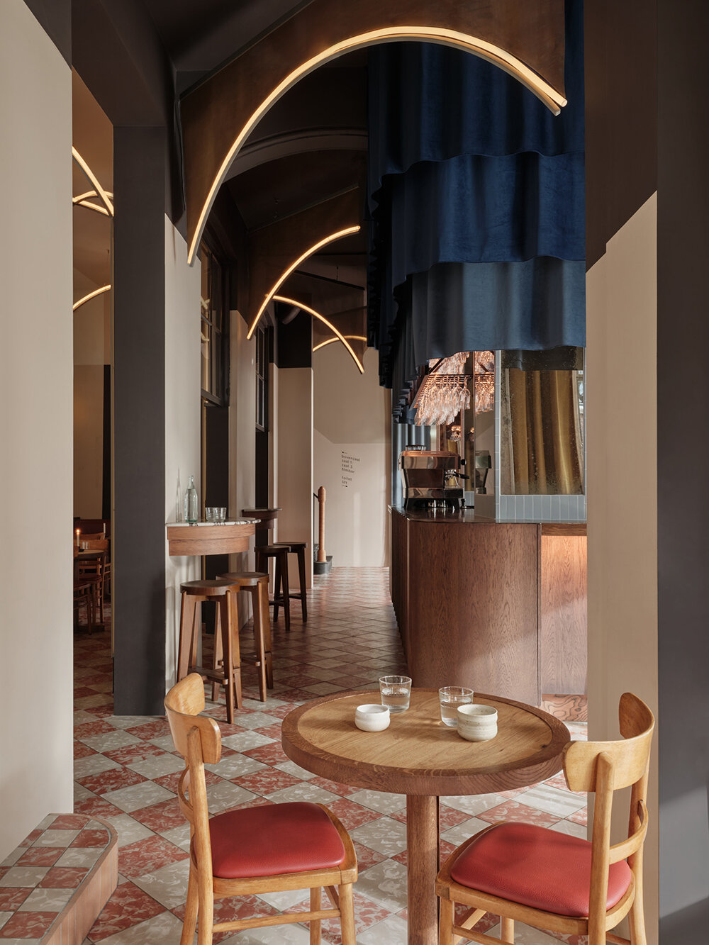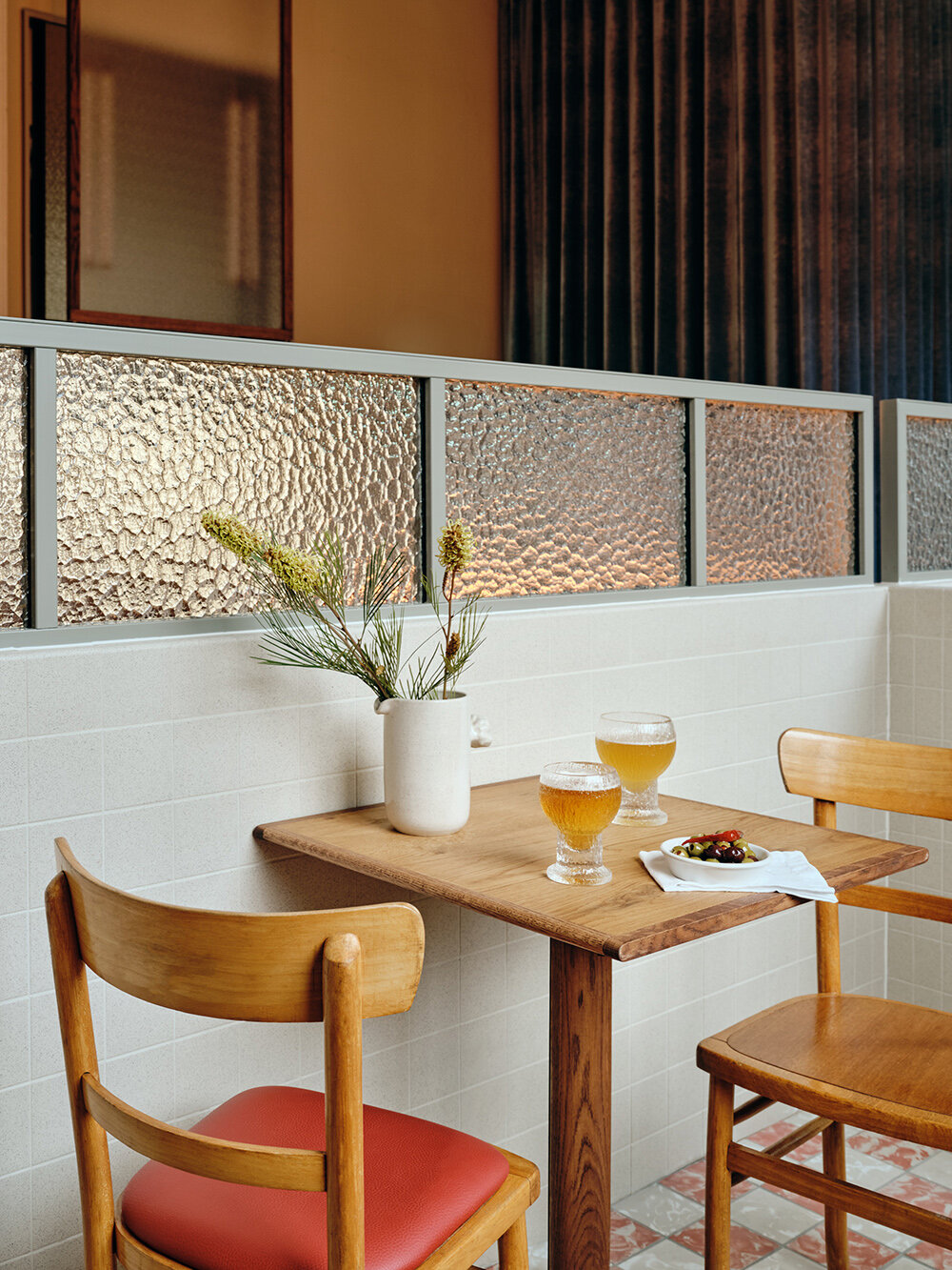 Two parts of the De Witt brasserie are elevated to play with height: one corner that looks out of the high windows and the central space opposite the kitchen. They both stand on a warm-colored, chess-patterned stone floor clad in Aigües tiles handmade in Mallorca. The elevated parts are differentiated by an alternative floor pattern with squares instead of diagonals. Seating in the three smaller areas is provided by custom benches in the same shade of vermillion as in the main brasserie but with leather backrests and seats. The presence of the school is felt in the wooden divisions that demarcate where one should sit – however, nobody will mind if you break the rules here. The seating’s rounded edge details where the bench meets the wall indicate the softening of etiquette. Windows in these spaces and throughout the ground floor feature wimple frames inspired by the nuns’ head covering, made of thick dark linen and a warmer shade of grey.