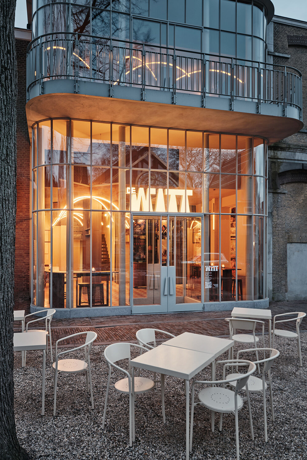 Completing the brasserie is a multifunctional event room, ideal for hosting anything from poetry recitals to dance performances. Dark brown and taupe velvet curtains hang worldwide, concealing a door to a kitchen that allows events to be fully catered. Lighting is provided by colored glass hanging lights and the De Witt signature alabaster lights on the walls. The window frames here are darker to better frame the view over the picturesque houses on the other side of the street. ‘It’s the perfect culmination of a collection of carefully designed spaces that will host many unforgettable evenings for the people of Dordrecht,’ concludes Studio Modijefsky.