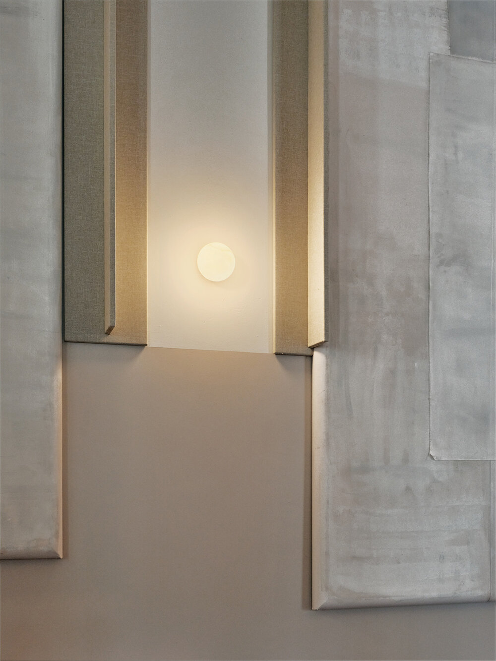 Wimples also surround a series of ‘fake windows’ that mirror door openings in the brasserie. These are made of recycled canvas painted in shades of ivory, off-white, and subtle power dues to create new artworks that capture the interplay of light and shadow throughout the interior. Handcrafted alabaster lights between these windows decorate the entire De Witt interior.