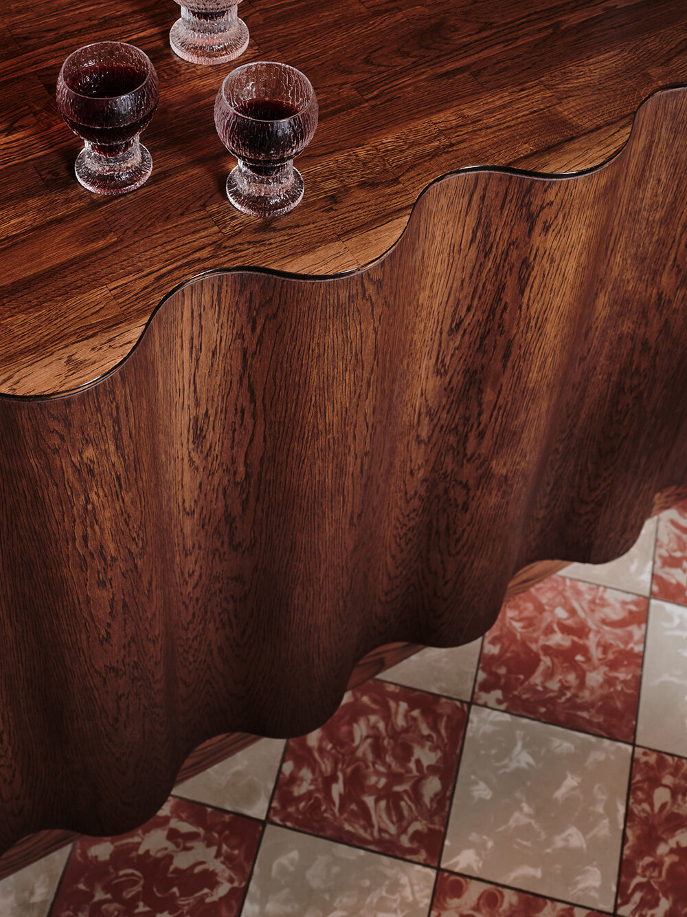 Two staircases lead diners upstairs, which incorporate custom-made boards for movie posters with alabaster sphere lights above them and wimple shapes around them. At the top of the stairs, a film lounge with a bar and ticketing area emerges, with a floor pattern echoing the one downstairs but made of two shades of oak instead of tiles. A simpler version of the cloister arch lights without the aged brass mesh crowns conducts routing between the lounge and the two cinema screens. The film lounge is split by a wall, with a ticket booth on one side and a bar on the other. The bar seemingly travels between the walls – similarly to the wavey shape downstairs but differently colored on each side of the wall: dark oak for the ticket booth, painted blue for the bar.