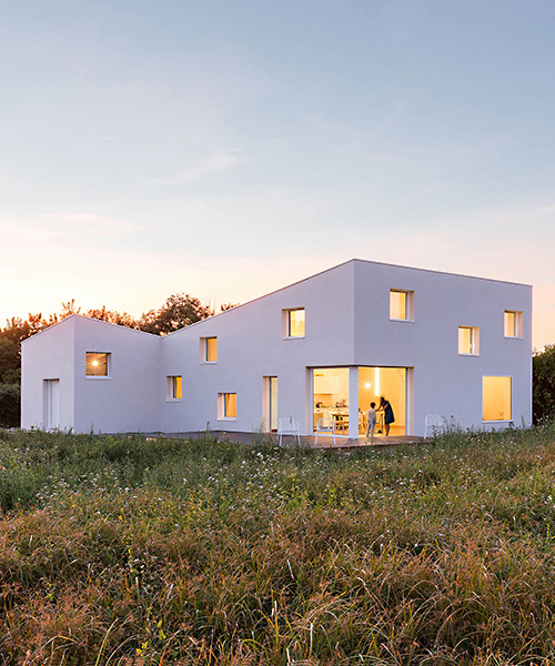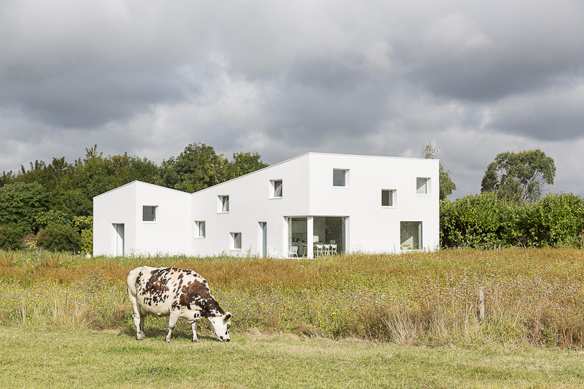 paris-based studio razavi architecture has designed a house commissioned by a photographer as both his summer house and studio. the concept was developed after some façade studios were made, defining a simple and smooth building skin, varying in height and punctured by glass openings. two volumes were made, one for the main living areas and the other for the work spaces, converging in the north corner, freeing up as much space as possible on this lot located in bretagne, france.