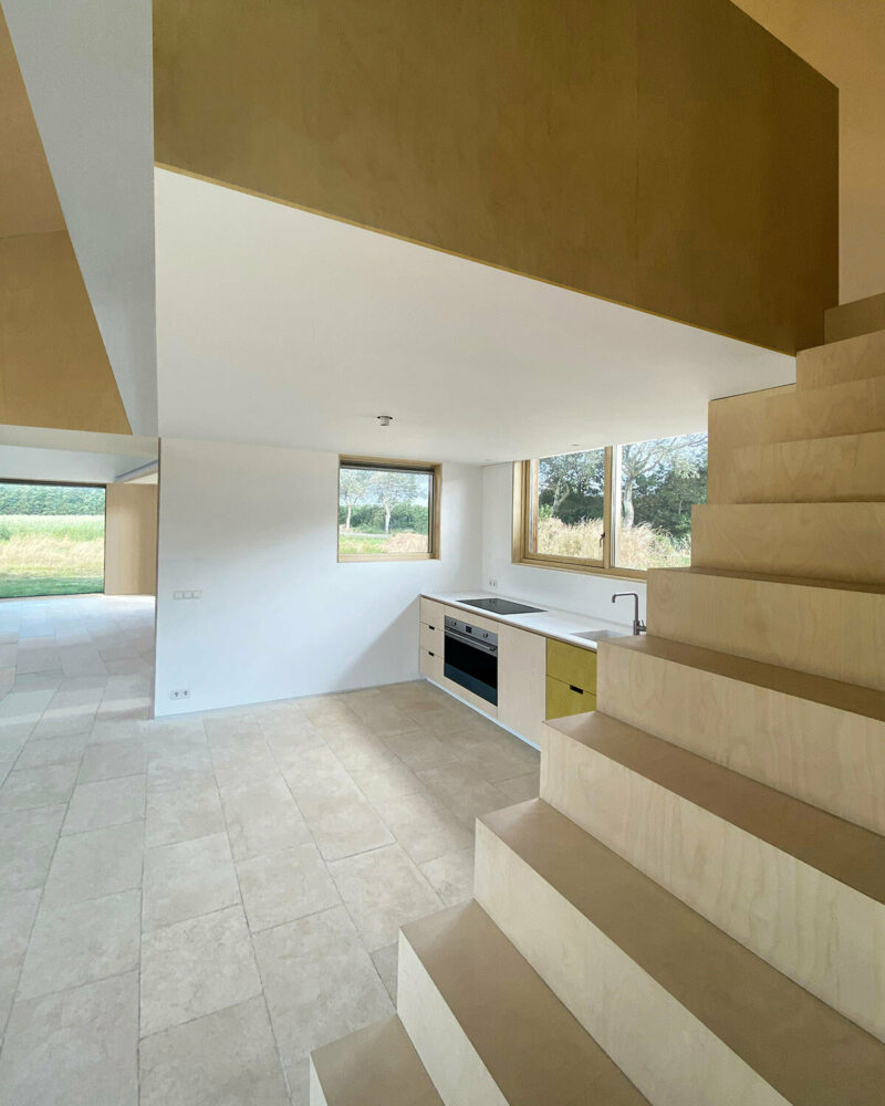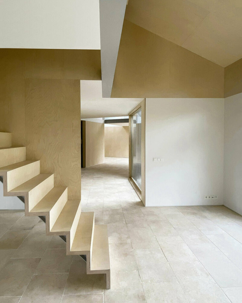 One of the defining features of the house is the unique character of each volume within. A horizontal division at a height of 2.4 meters (8 feet), marked by a shift in materials, elegantly demarcates the interior spaces. This transition encompasses birch plywood, stucco, and steel beams, orchestrating an experiential journey through the house. The interior becomes a curated landscape of spaces and transitions, where the choice of materials plays a pivotal role in defining each area’s atmosphere.