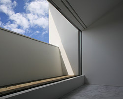 shadows are cast upon the white minimalist facade by a wrought iron decorative screen