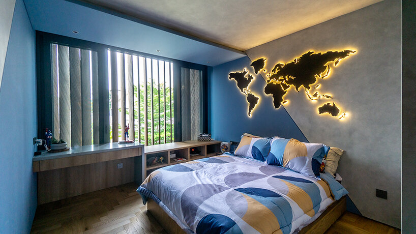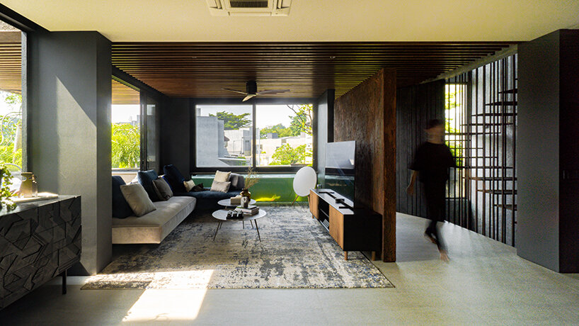 Every living space inside ‘OHIO House’ by StudioRK (see more here) forges a strong connection to the outdoors through windows, doors, voids, terraces, balconies, and skylights. They provide natural light and ventilation with different proportions of openings and shades, related to different activities and desired atmosphere. Beyond adding fresh aesthetics to the architectural design, the enveloping trees and shrubs also act as a buffer — from privacy to solar heat protection and generating a fresh air supply for the house.