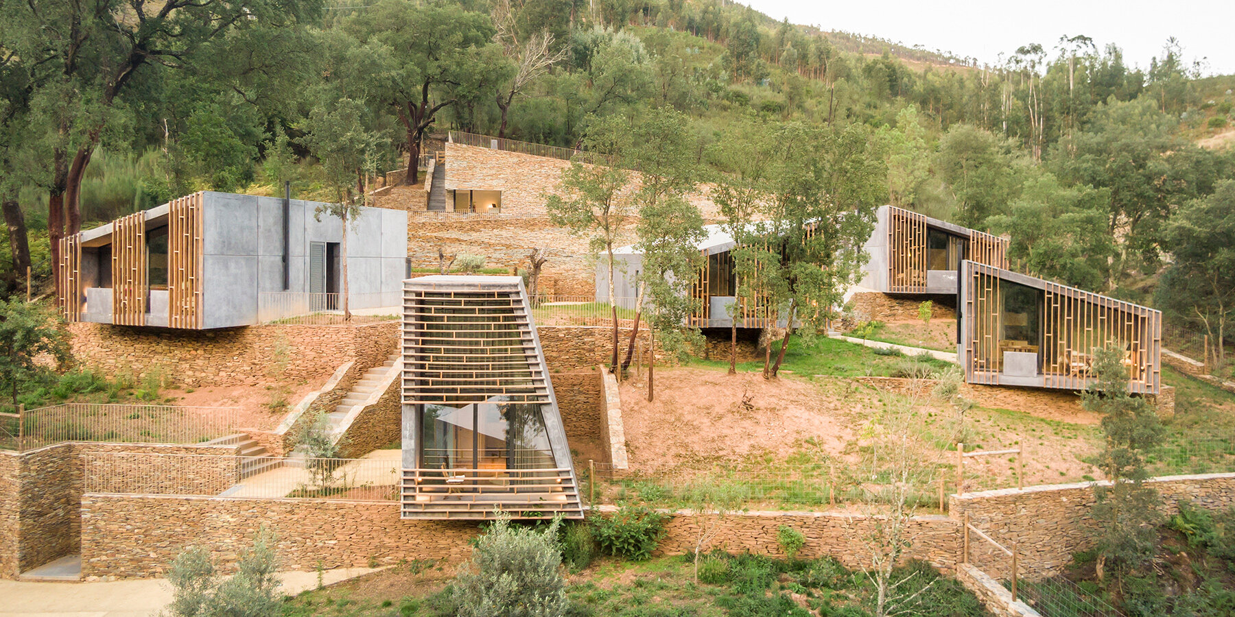 Portuguese architecture studio Summary scatters a collection of eleven cabins across the sloping landscape of Paradinha. The remote area is characterized by its nearly untouched nature, with a once-abandoned village occupied by a small group of people seeking a quiet and leisurely lifestyle. The architects at Summary introduce the tiny, prefabricated dwellings as a hotel retreat for visitors to experience this idyllic place.