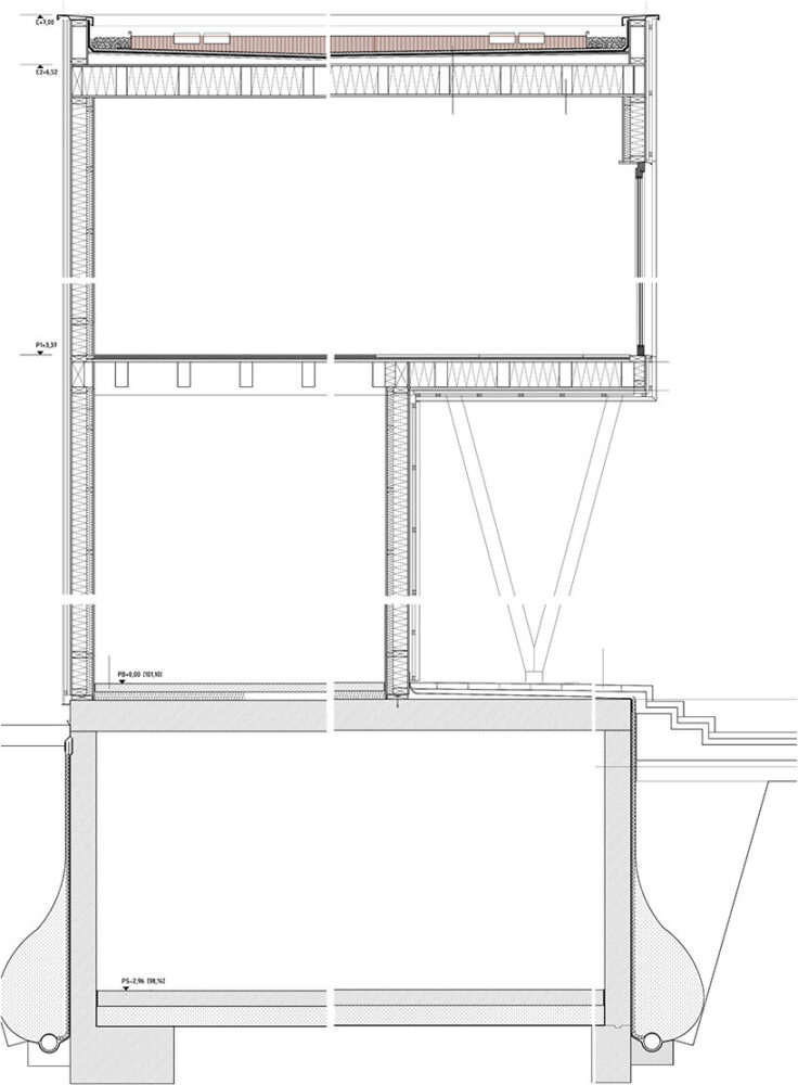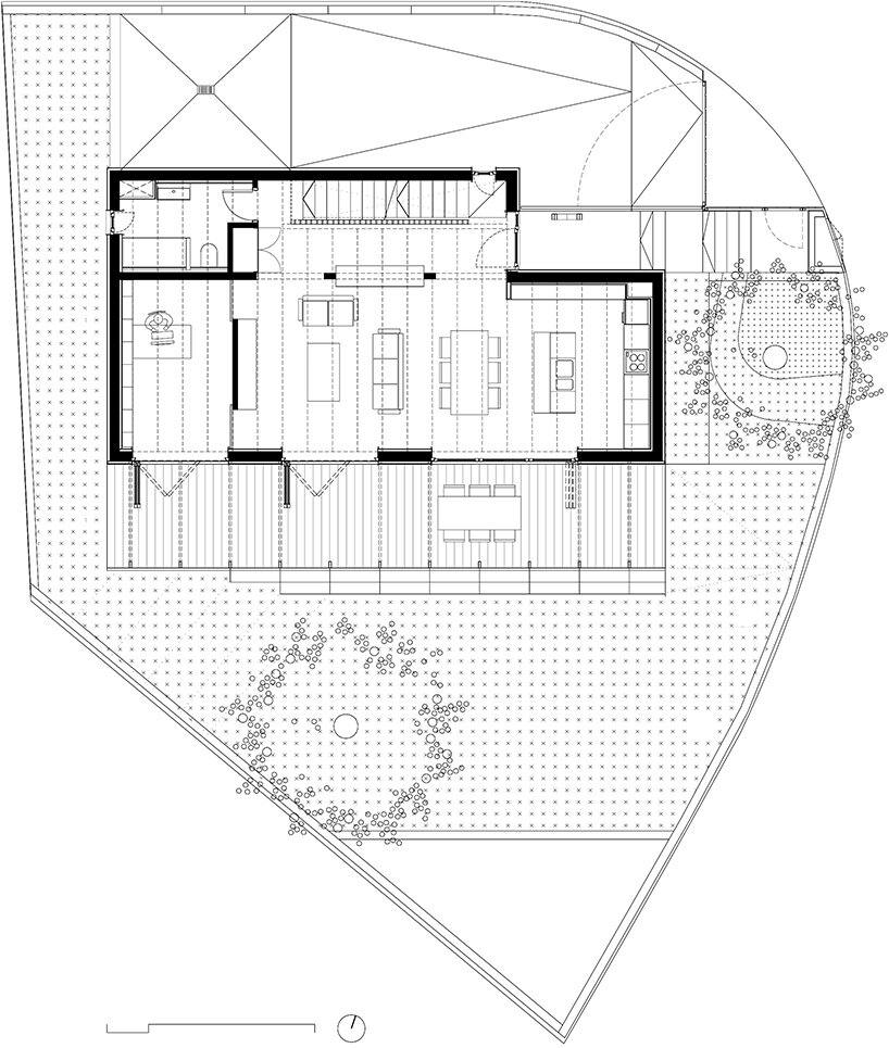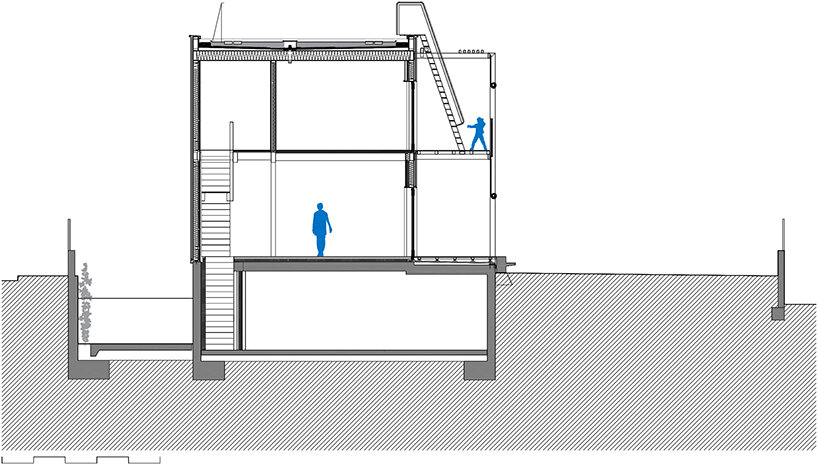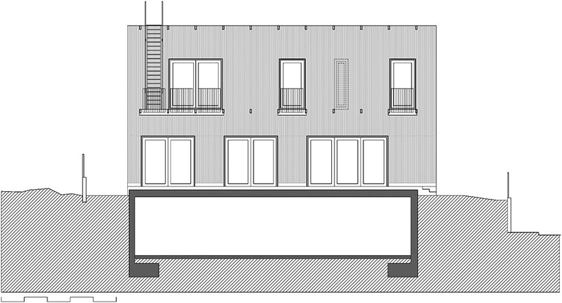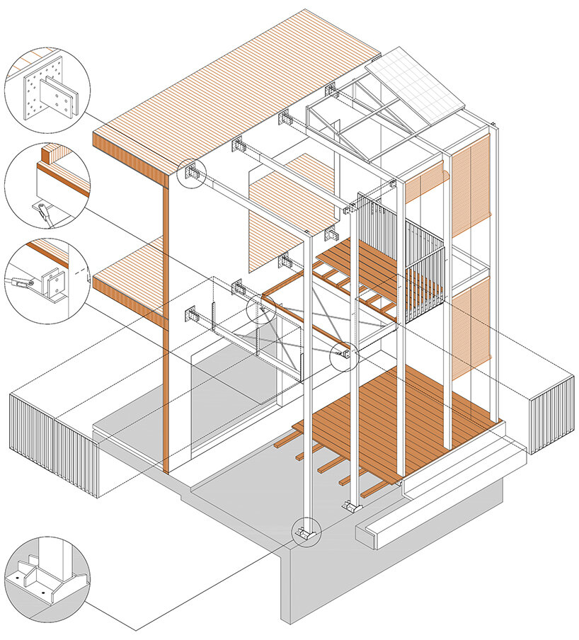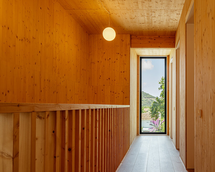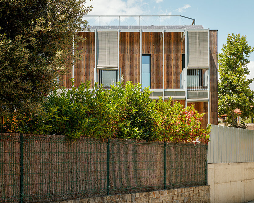 the design team at SUMO architects (see more here) explains the construction of its BE house, noting that the ground, and first floors are built with a ‘dry industrialized system.’ the frame stands as an assemblage of wooden slabs, beams, and a façade finished with thermo treated pine wood strips. the plinth of the house, in contact with the ground, is made out of concrete. a hot galvanized steel tube profile defines the porch. a slim structure generates an intermediate space between the inside and the outside. wooden rolled shooters protect the house from sun radiation and allow cross ventilation.