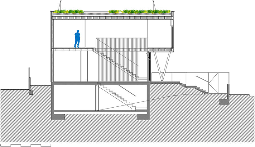 each material is used where it is most efficient — the team employs a green roof to protect against the exposure to direct sunlight to avoid overheating. a photovoltaic plant integrated on the roof produces the energy that the house needs. accumulation batteries allow the house to be unplugged from the electricity grid.