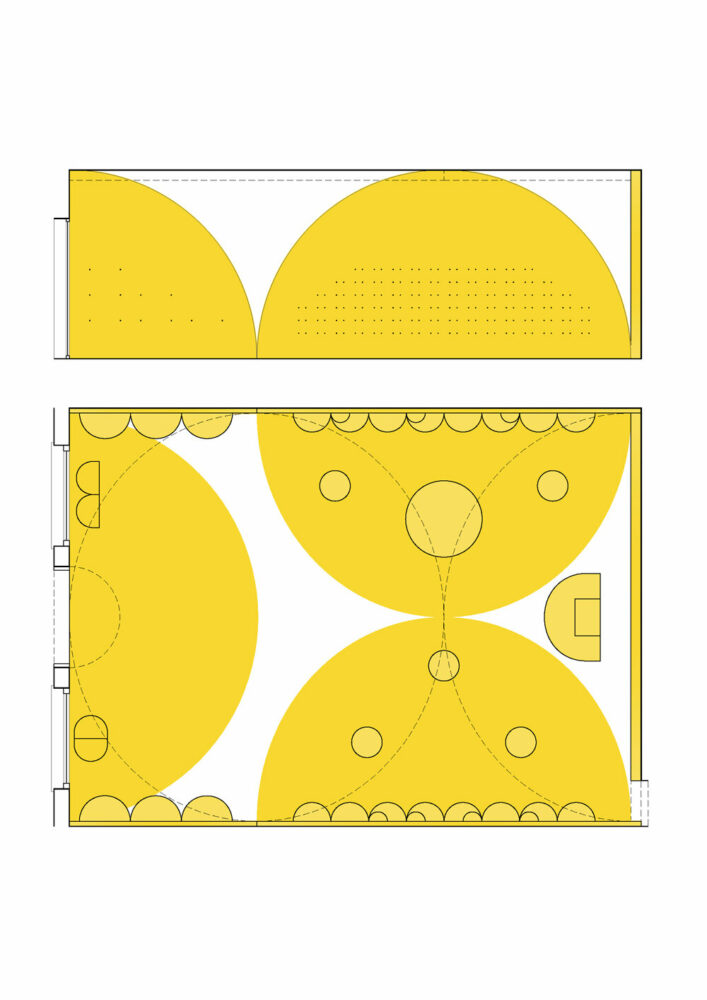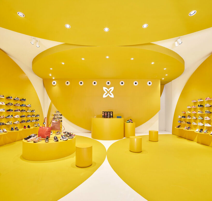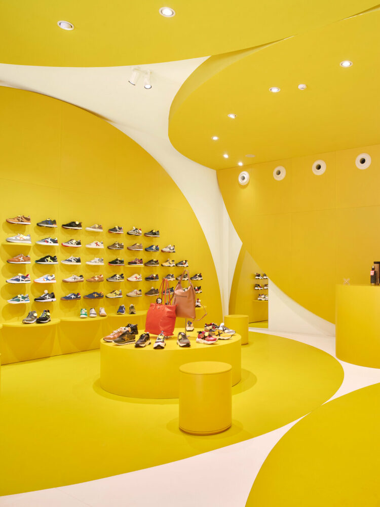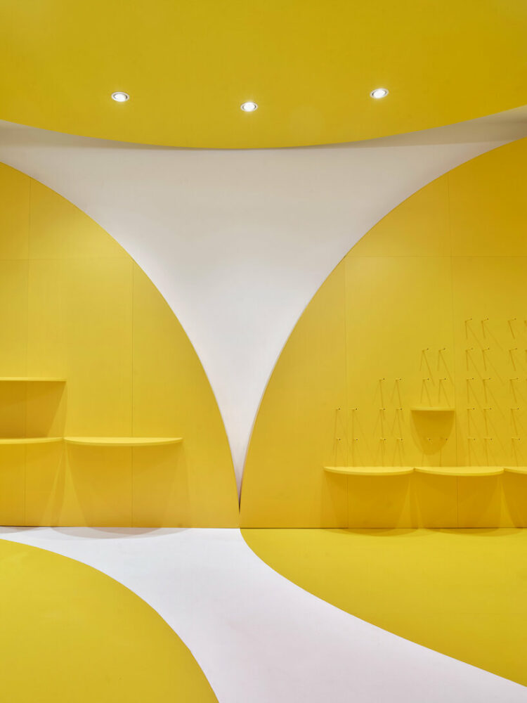 The team at Studio Animal (see more here) opted for yellow to offer shoppers a memorable experience. Complementing the vivid hue, geometric patterns extend from the walls to the furniture and fixtures, creating a visually dynamic environment that immediately captures visitors’ interest. Rather than treating individual components separately, the design approach emphasizes a unified envelope that adapts to all commercial needs. This approach ensures that every aspect of the shop contributes to the overall brand experience, making it both memorable and effective.