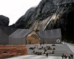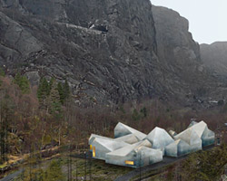 norwegian firm superunion architects has collaborated with danish and dutch practice powerhouse company to propose the ‘jøssingfjord museum’ for the national association of norwegian architects competition to create a new cultural facility for jøssingfjord, norway. paying homage to the past occurrence of mining activities in the immediate area, the center accentuates the presence of the nearby hydro power station and naturally occurring geology and caves. carefully incised into the base of a gorge, the form allows nature to be hierarchical to the structure while minimally obstructing views across the valley.