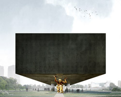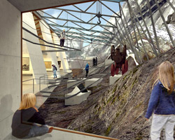 a gently sloping butterfly roof directs visitor’s attention outwards towards the adjacent river and regent cliffs. the formally subdued canopy shelters the galleries, cafe and auditorium while directing daylight through the interior. organized by a flexible orthogonal grid, the spaces may be adjusted for diverse exhibitions, accommodating a range of pieces and displays.
