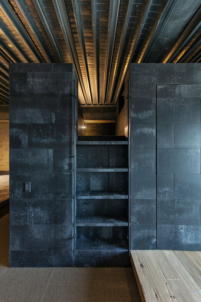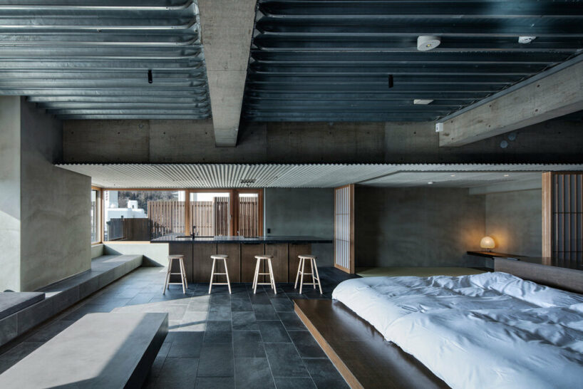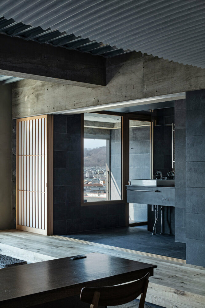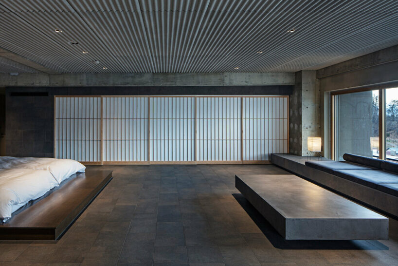 the project sits like a ring placed over the terrain, with its funnel-like roof forming a shaded perimeter walkway and an introverted core.