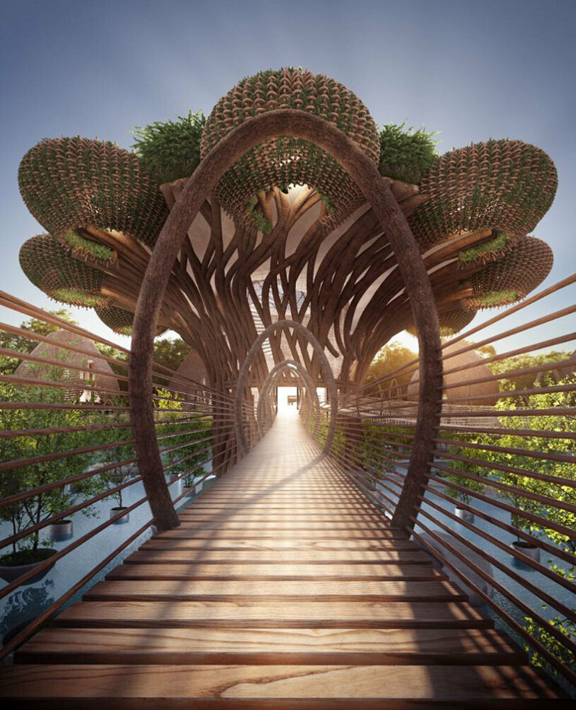 Following its nature-filled ‘Cocoon’ hotel, Barcelona-based architecture firm DNA is unveiling another resort design dubbed ‘Life Tree’ in Tulum, Mexico. Fully embracing the local jungle, the project is composed of ten ‘nest’ villas and twenty hotel lounges clustered around a tree-shaped structure that serves as the heart of the complex. Suspended walkways allow users to wander through the premises and be captured by the natural environment, which enhances the experience.