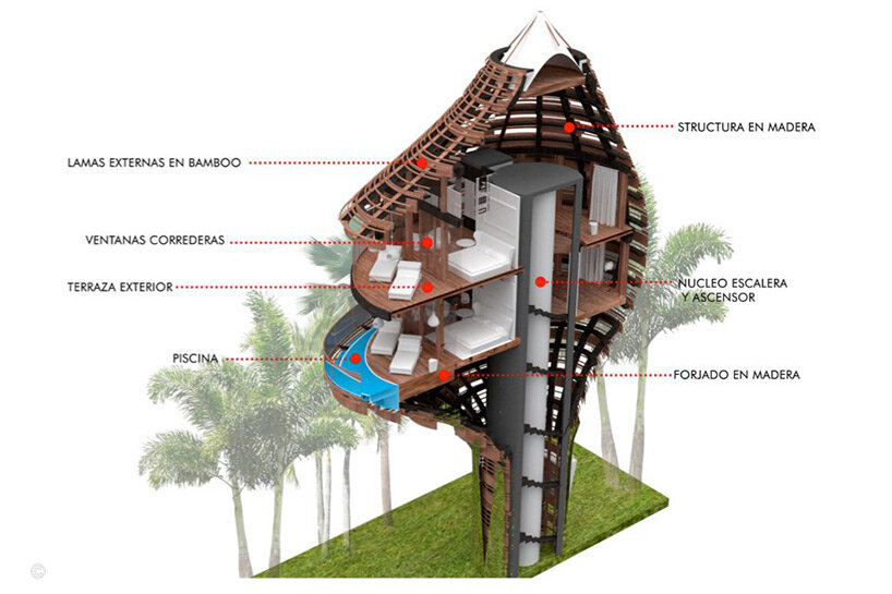 the project is composed of ten ‘nest’ villas clustered around a tree-shaped structure