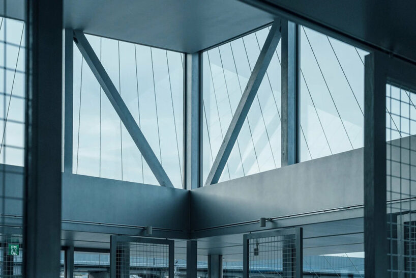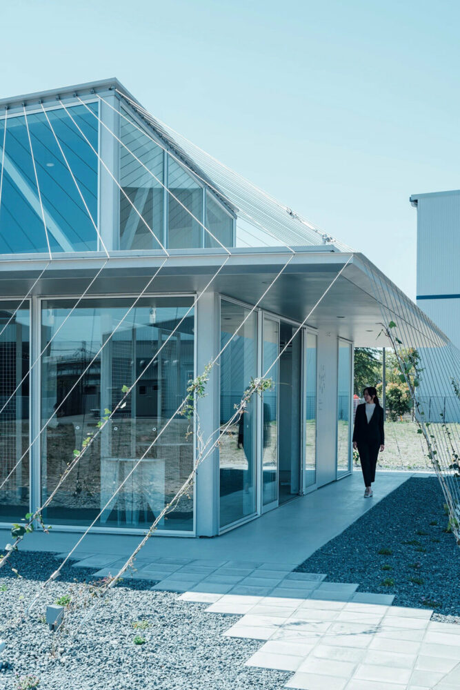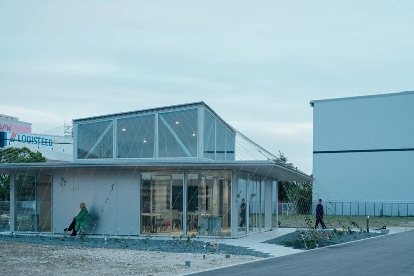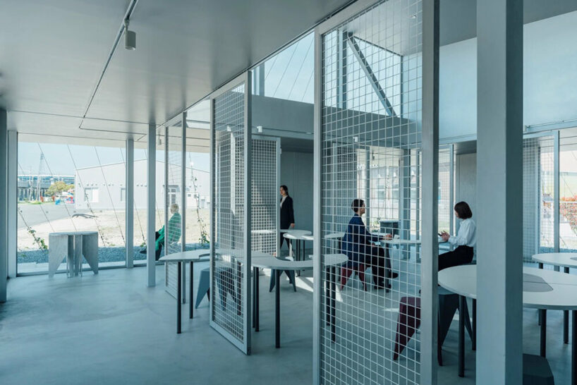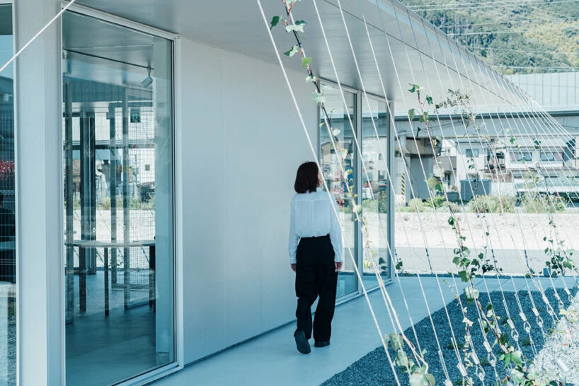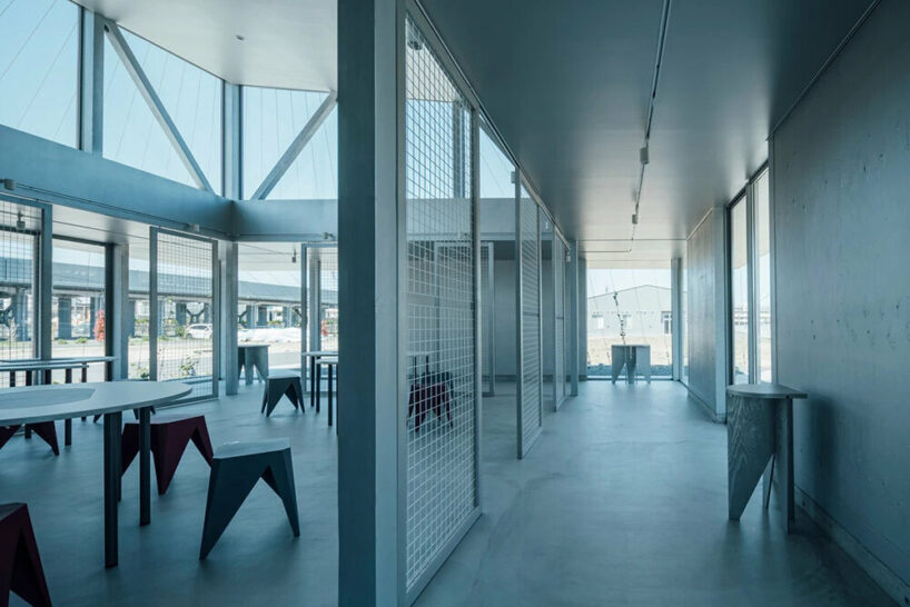 the project sits like a ring placed over the terrain, with its funnel-like roof forming a shaded perimeter walkway and an introverted core.