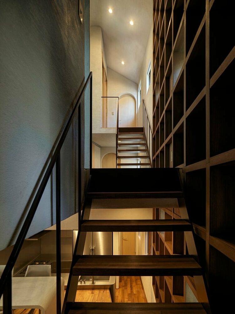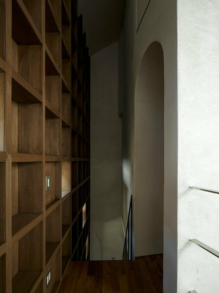 Referred to as ‘ponds and banks’ by the architects, these zones accommodate for the need for a variety of public and private shades throughout the space, and  allow for subtle and flexible use of space in a very compact dwelling. Further, a wooden stairway runs up through the void, creating a three-dimensional composition that sparks a narrative experienced through the body.