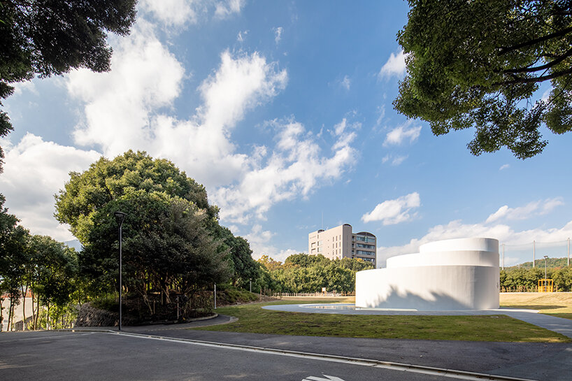 Japanese practice T2P Architects was invited to design a circular visitors plaza at the entrance of the Atsugi Forest Environmental Research Center, a training facility owned by Kansei Kogyo, which specializes in managing and cleaning sewer pipe networks. Set in the Morinosato district of Atsugi City, Kanagawa, the plaza features a three-layered circular courtyard comprising outdoor toilets, washbasins, and disaster prevention wells, elements usually located at a corner of the park. At the center, a water garden brings a bout of freshness and a layer of play for children visiting the space.