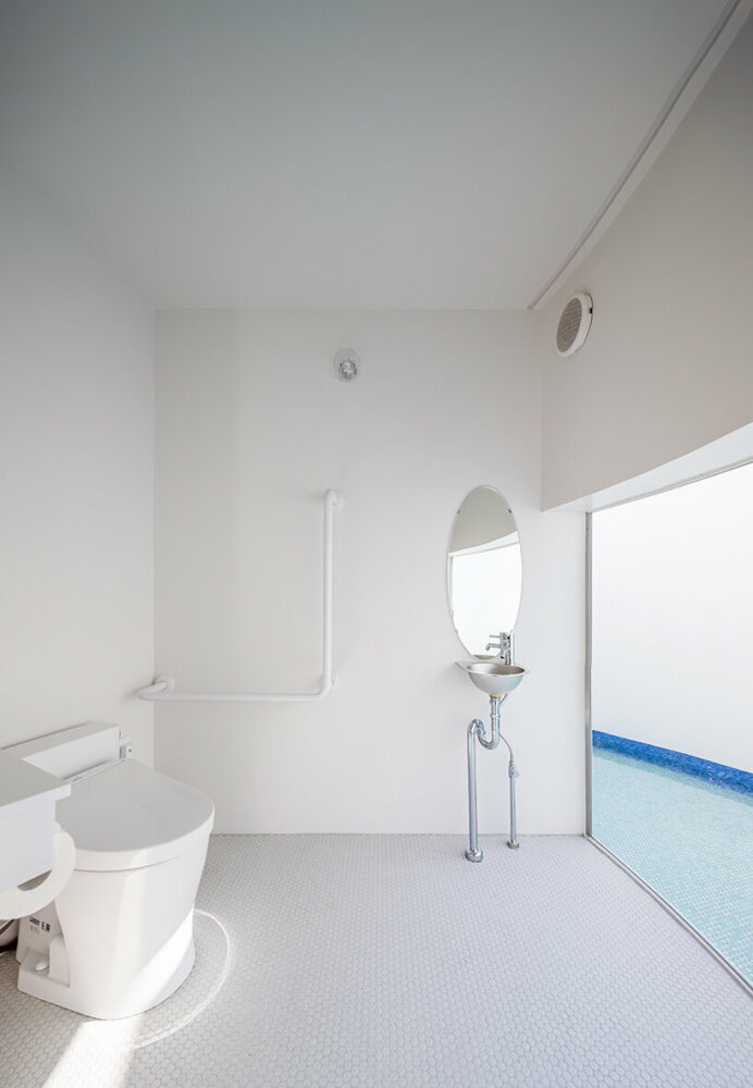 an outdoor washbasin and four toilets occupy the courtyard-like volume