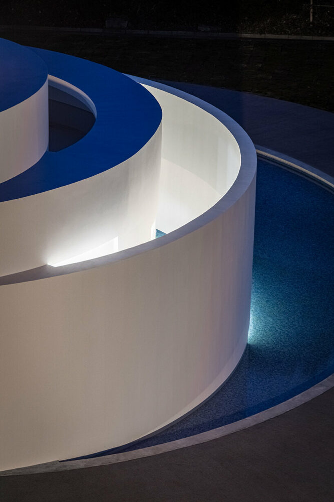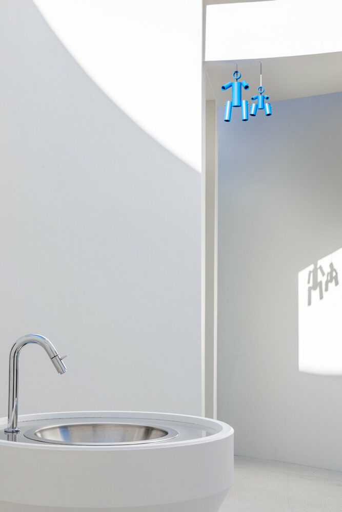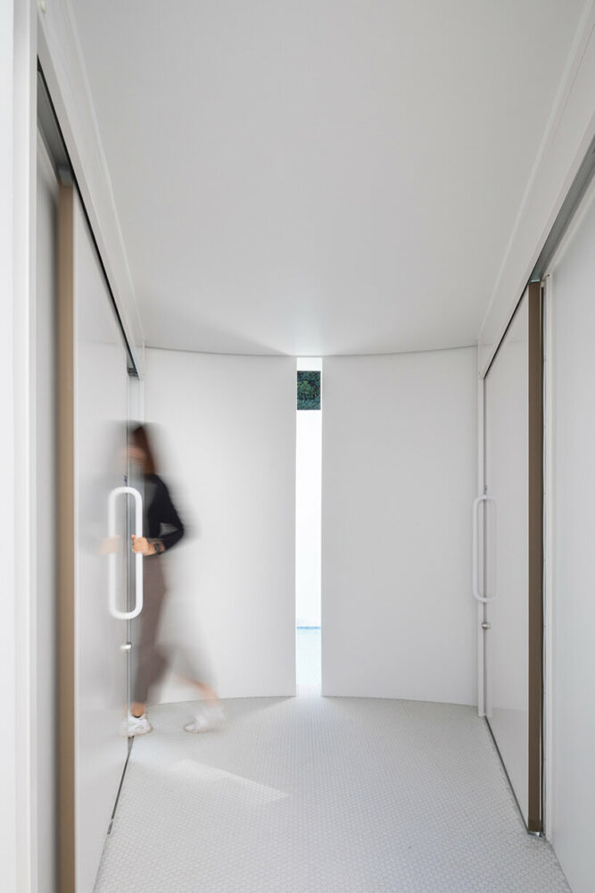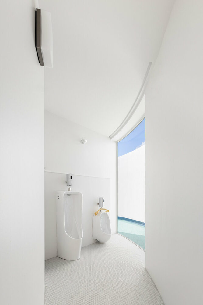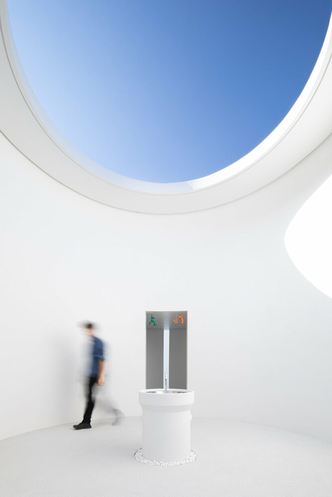 The central courtyard is an outdoor washbasin space where one can feel the sound of the water flowing in the water garden. The four restrooms surrounding the courtyard, each with a view of the water garden, are quiet spaces with independent walls blocking the outside view. On the other hand, the outside of the floating wall was planned as an active water area for children to play with water in continuity with the grass. The abstract white space that amplifies the presence of water reflects the company’s continued commitment to purity,’ writes T2P Architects (see more here).
