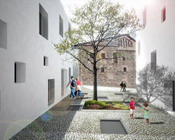 the project sits like a ring placed over the terrain, with its funnel-like roof forming a shaded perimeter walkway and an introverted core.