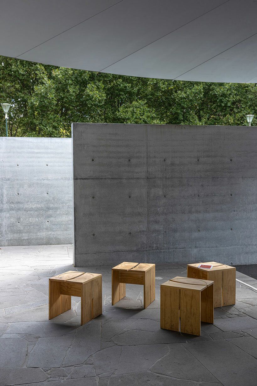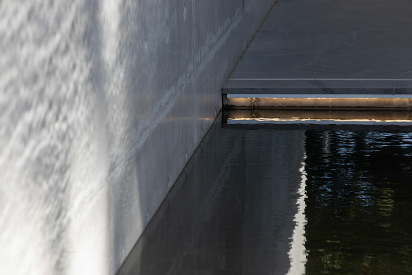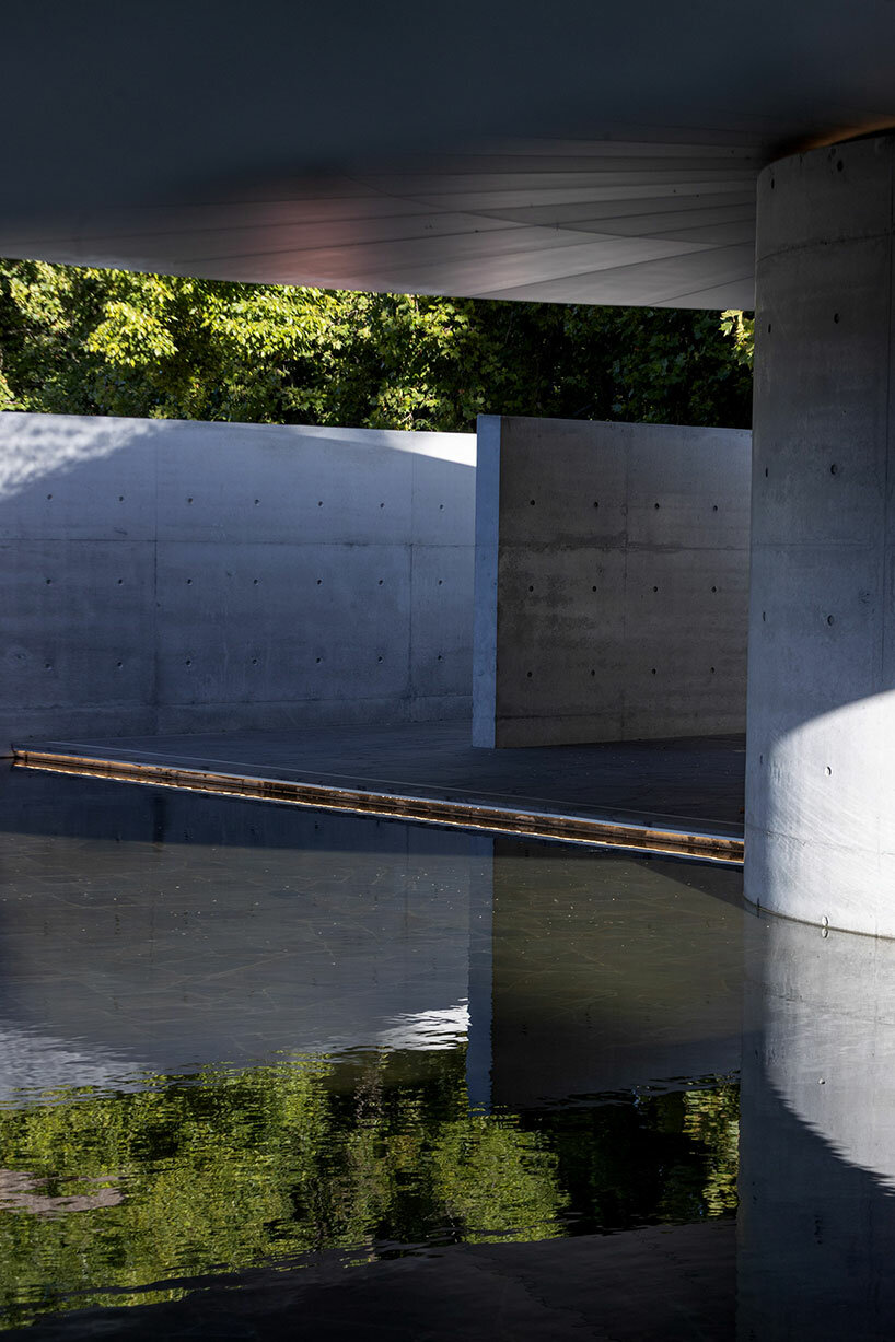 the geometric forms are accentuated by an internal arrangement—half-paved and half-reflecting pool