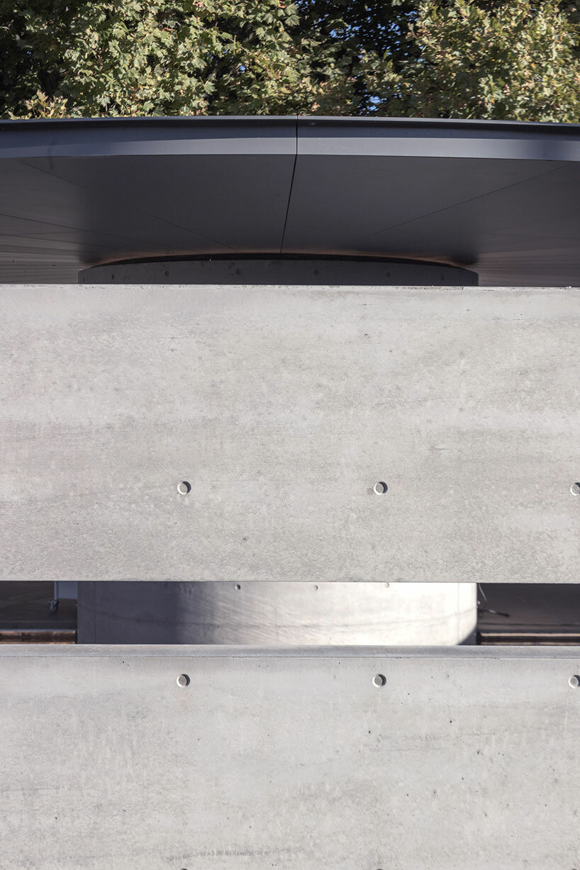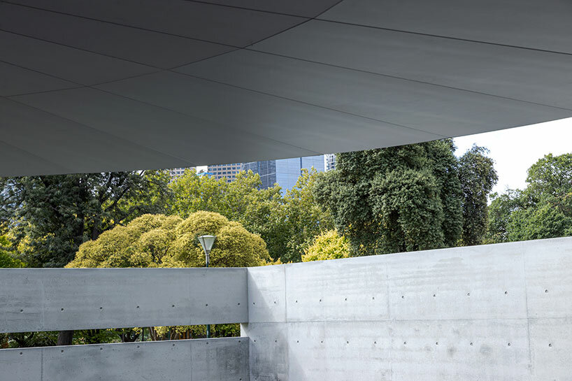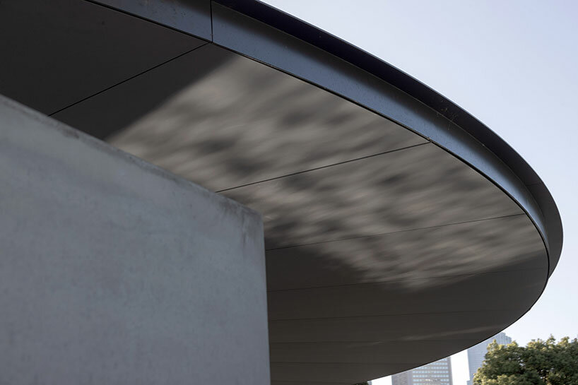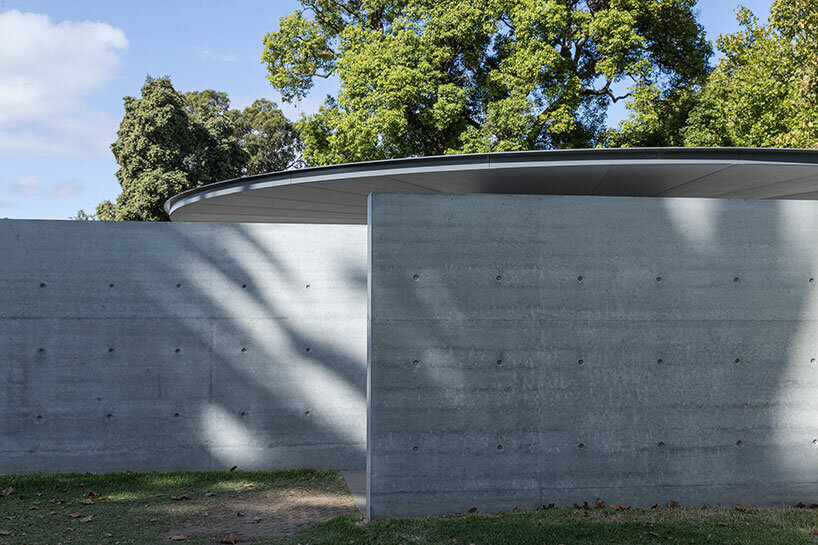 the project sits like a ring placed over the terrain, with its funnel-like roof forming a shaded perimeter walkway and an introverted core.