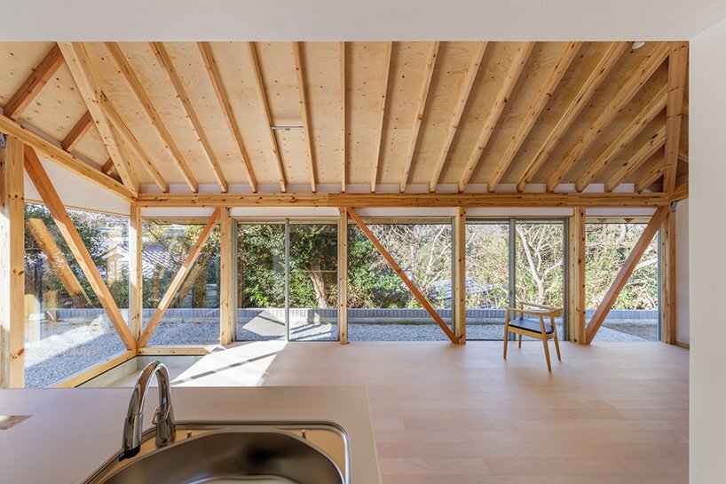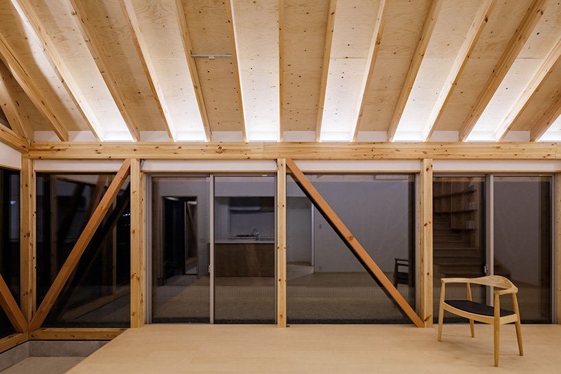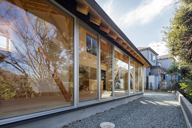architecturally, the house is built of wood with flat, nest-shaped spaces and a cross-sectional composition holding a sloped roof. from the outside looking in, passersby can see wooden beams outlining the glazed façades. this exposed wooden design helps distinguish the interiors from the exterior structure and sharpen the placeness of each room for more straightforward navigation.