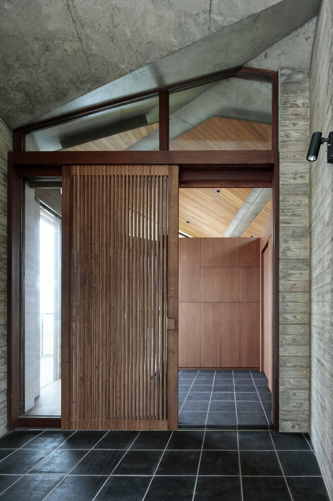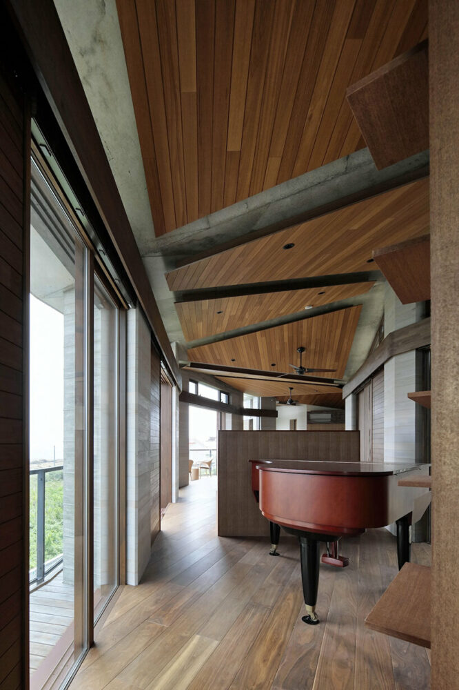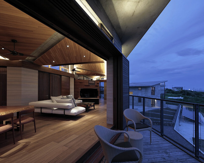 Situated in Japan’s Minamiboso City, ‘Villa MKZ’ emerges as a private weekend dwelling, seamlessly weaving around the site’s complex and tricky conditions. While offering a scenic ocean view to the southeast, the plot includes a 1.4 m elevation gap at its center, around an outcropping of bedrock, and an unbuildable area cutting into the property on the street side. These restrictive conditions pushed Takeshi Hirobe Architects to craft the reinforced concrete structure like an accordion that traces the buildable parts of the site.