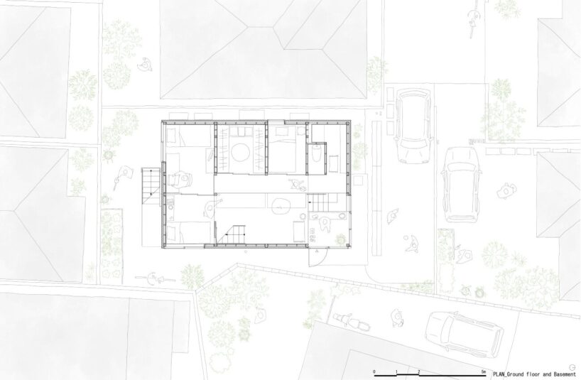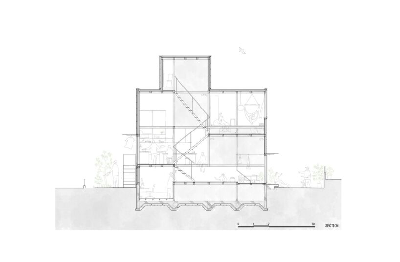 the project sits like a ring placed over the terrain, with its funnel-like roof forming a shaded perimeter walkway and an introverted core.