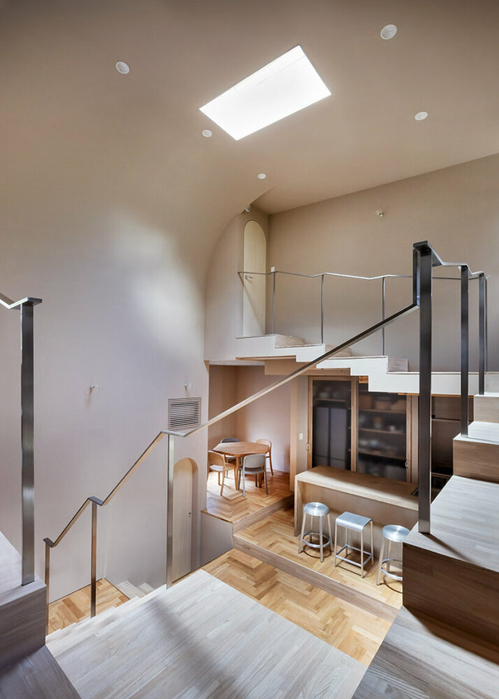 That being said, he summarized the cats’ needs into three categories: (1) Being able to choose their preferred temperature level at any time of day; as they can sense temperature differences that humans cannot, they like to move around to find the perfect spot. (2) The desire to be in same room as their owners, all while maintaining their space. (3) And lastly (3) the need to have multiple safe places to hide; they like options and may change their minds about where they feel safest depending on the time of day or year. With these in mind, the residence was conceived as a large spiral staircase, known as a caracole, with multiple nooks and crannies, incorporating both the owners’ and pets’ needs.