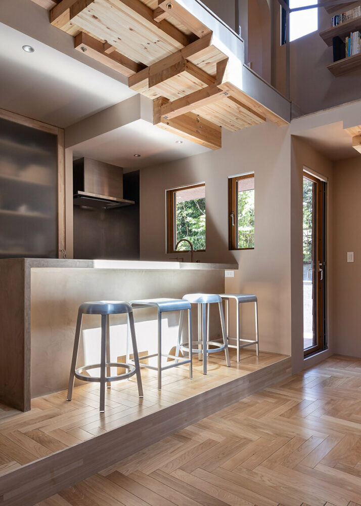 To design the caracole, Yamanouchi took cues from a tamasudare, a screen made of loosely woven bamboo sticks for a traditional Japanese street performance, where performers twist, fold, and extend it to form various shapes. Exposed to give accent to the open ceiling space, this structure responds to the highly humid environment of Kamakura with its starkly designed split-level architecture. ‘The standard floor level is set one meter above the ground level, creating a buffer space between the raft foundation and the floor, where outside air is introduced, and hot water pipes for floor heating are laid. We designed the buffer for temperature and humidity control,‘ he continues.