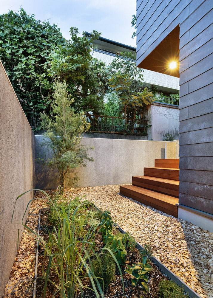 As for the landscape design, the garden is divided roughly into two zones. One is the Approach Zone, which leads to the entrance and the garden facing the front road. Another is the Terrace Zone, which includes the wooden deck steps and a kitchen garden, surrounded by a 1.8-meter-high wall on the back of the building. Approximately 80 species of plants are flourishing in the Approach Zone, boasting different colors for a rich palette, and 20 species of edible herbs in the Terrace Zone. Completing the outdoor design is a space covered with fragrant wood chips, offering a place to sit on the steps and enjoy a meal.