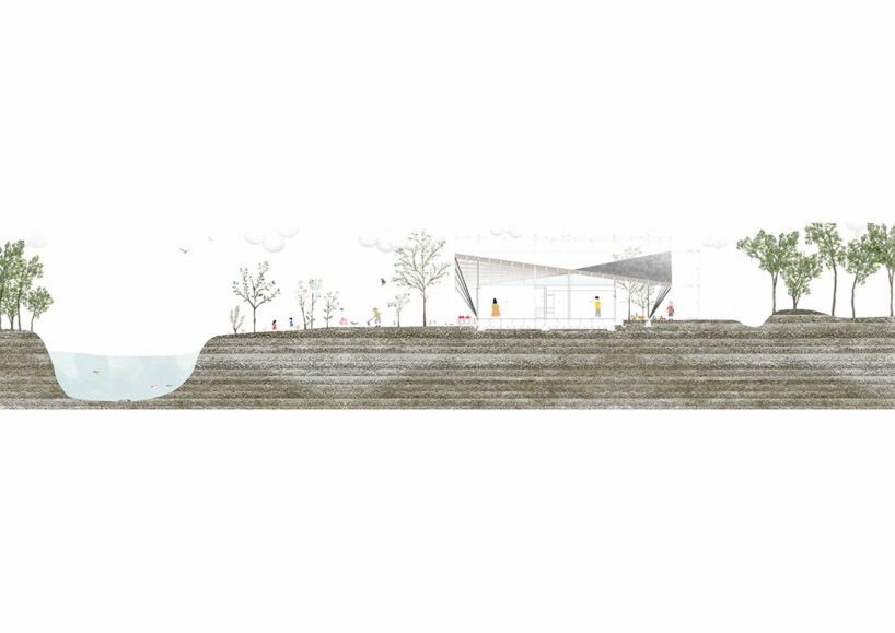 the project sits like a ring placed over the terrain, with its funnel-like roof forming a shaded perimeter walkway and an introverted core.
