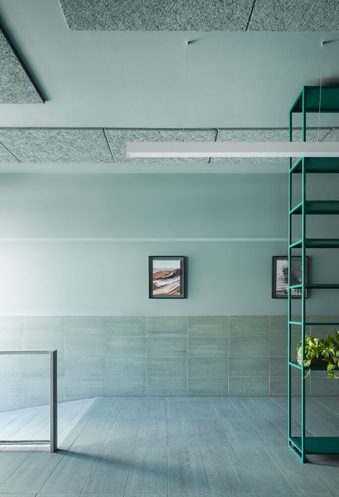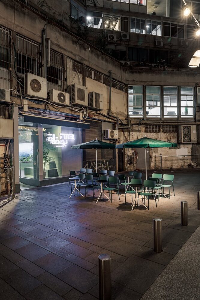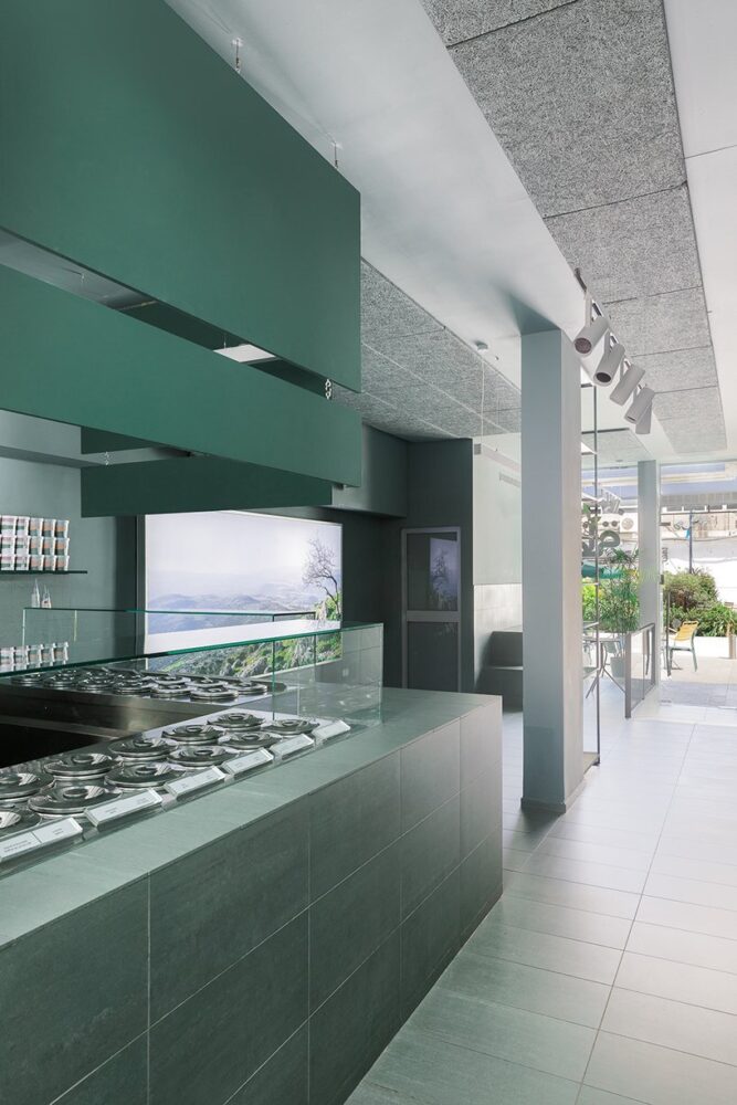 this particular shade references the green scenery which buza comes from. that same galilee landscape is also displayed on a large 3 meter long light-box. the color of the space was also meant to complement the newly designed ice cream cups and packaging. on the long wall of the shop, a series of five abstract posters are exhibited. they were created as ice cream inspired art pieces by evian-saggi studio, the graphic designer who did the packaging rebranding.