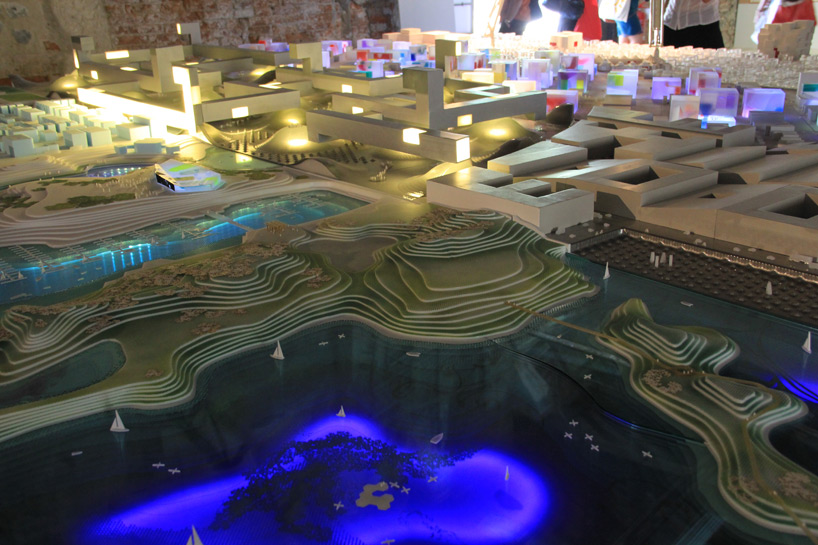 ‘displacement of the gridiron with the cloister’ by stanley tigerman, 2012, 3D printed plastic and acrylic blocks on painted wood base with aerial photograph base images © designboom