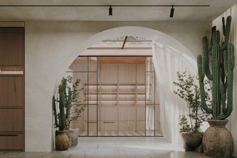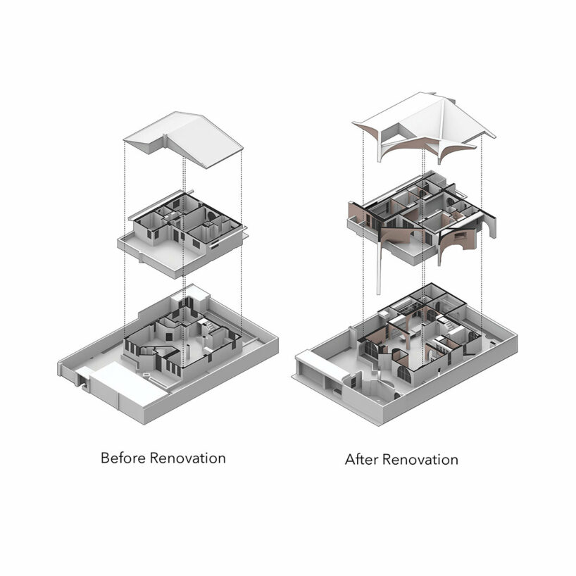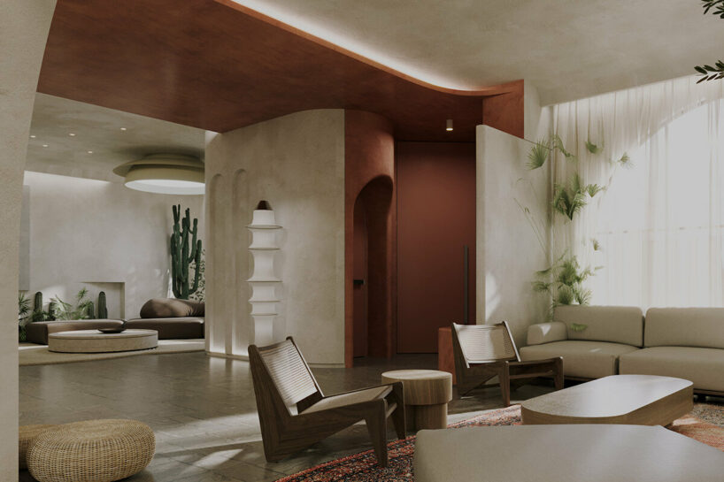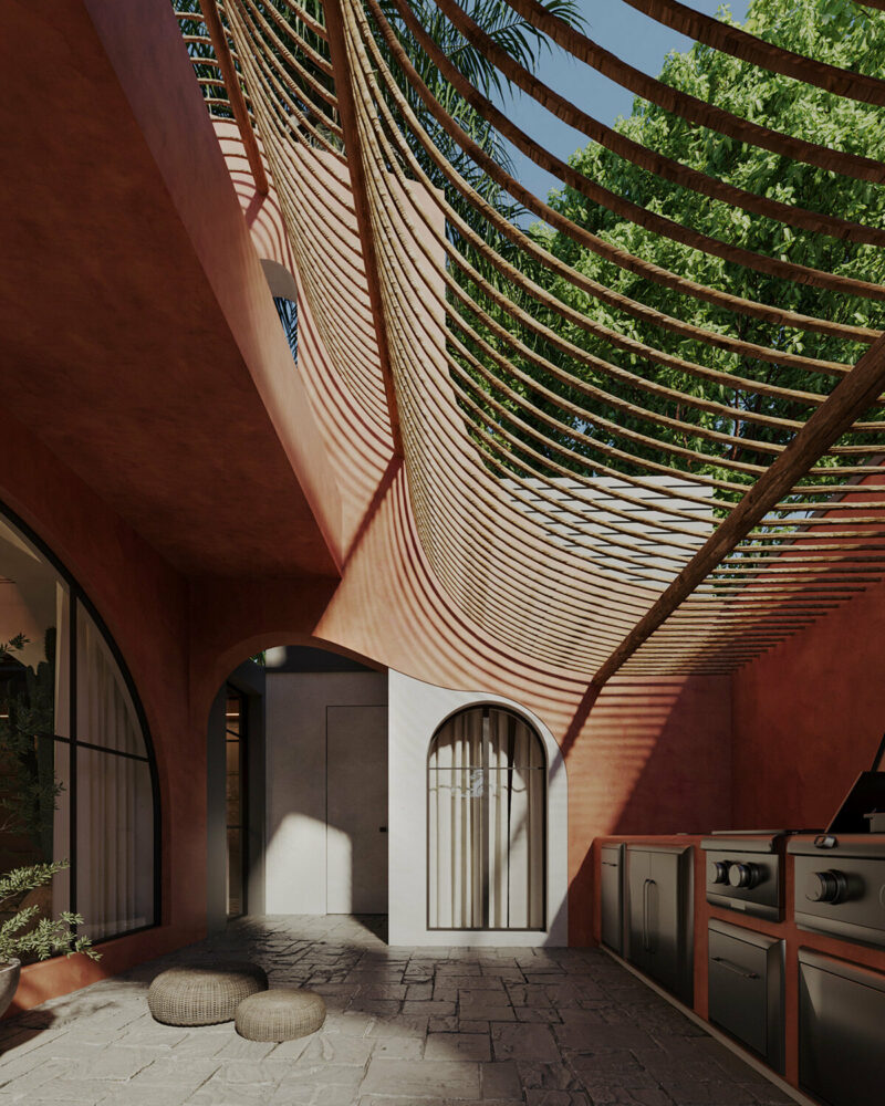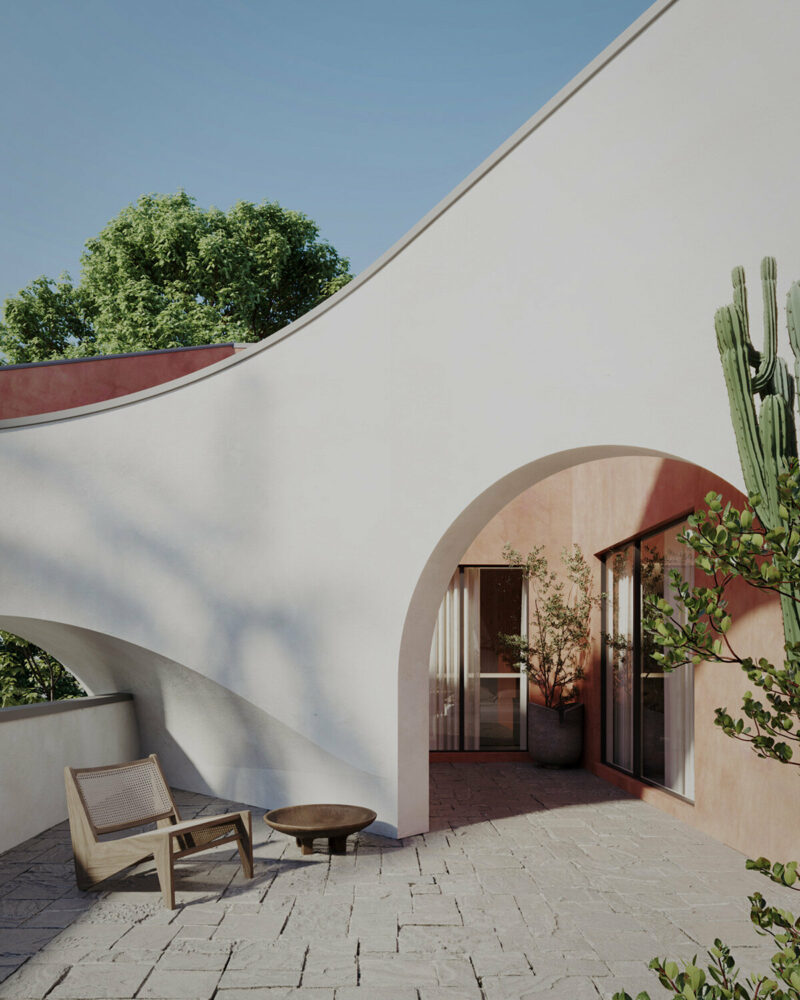 the project sits like a ring placed over the terrain, with its funnel-like roof forming a shaded perimeter walkway and an introverted core.