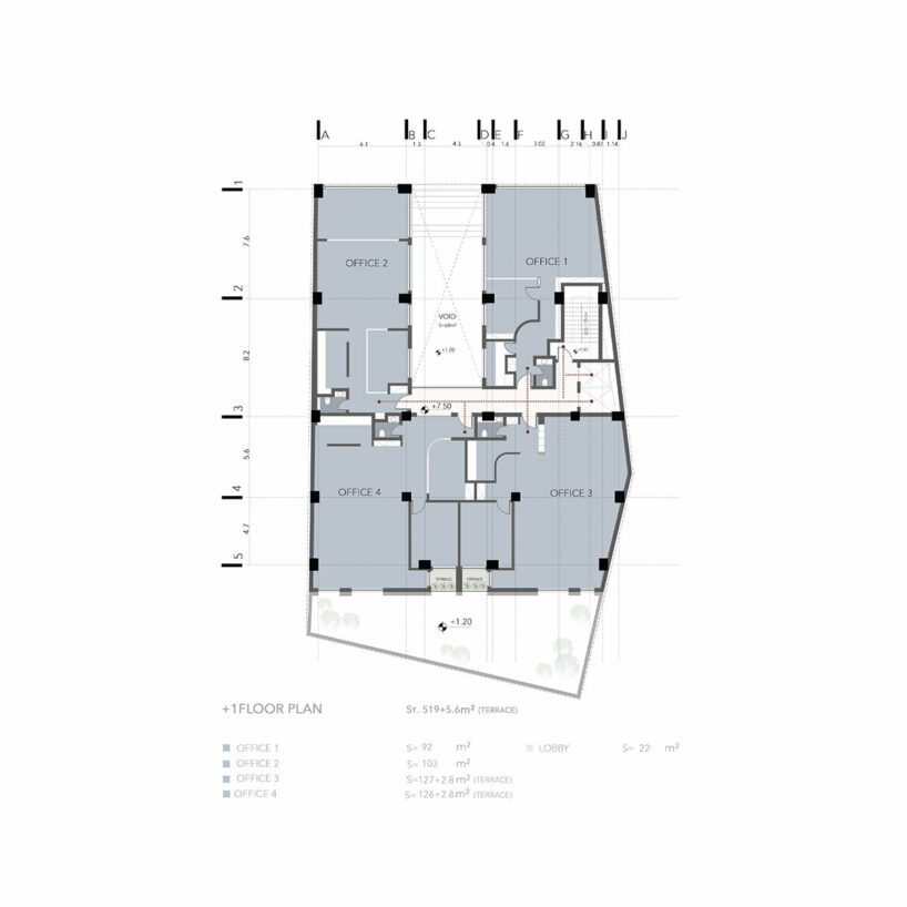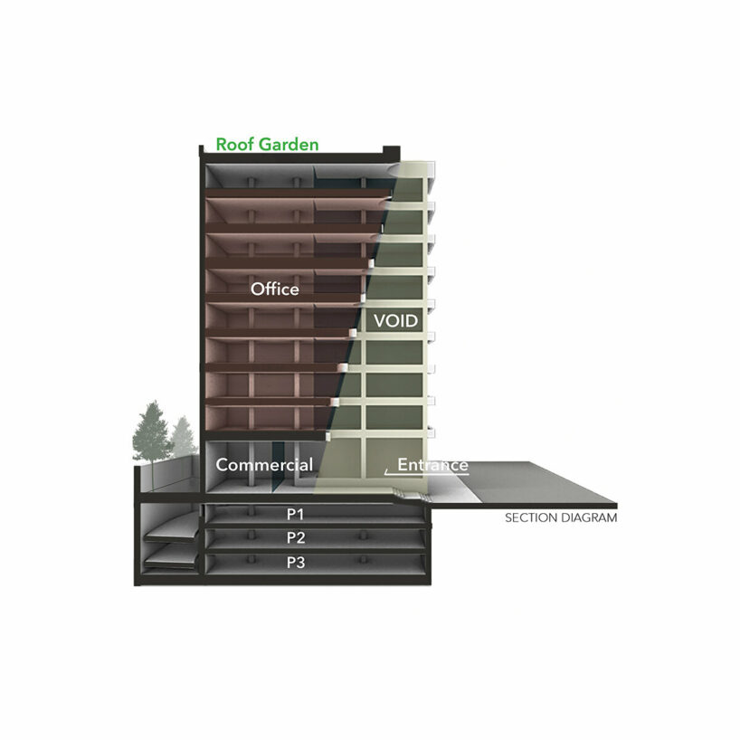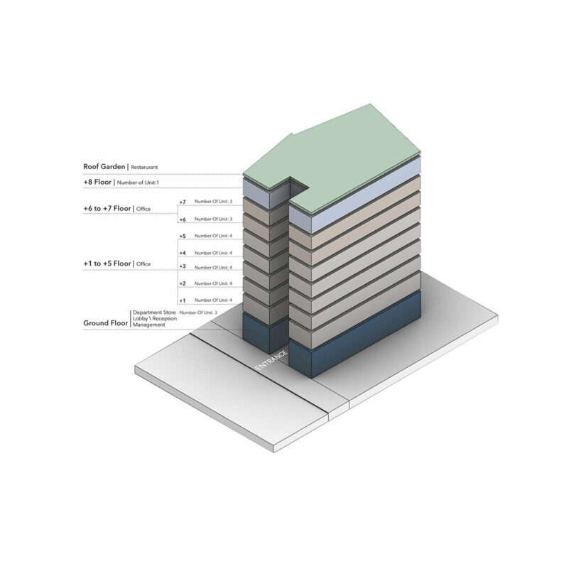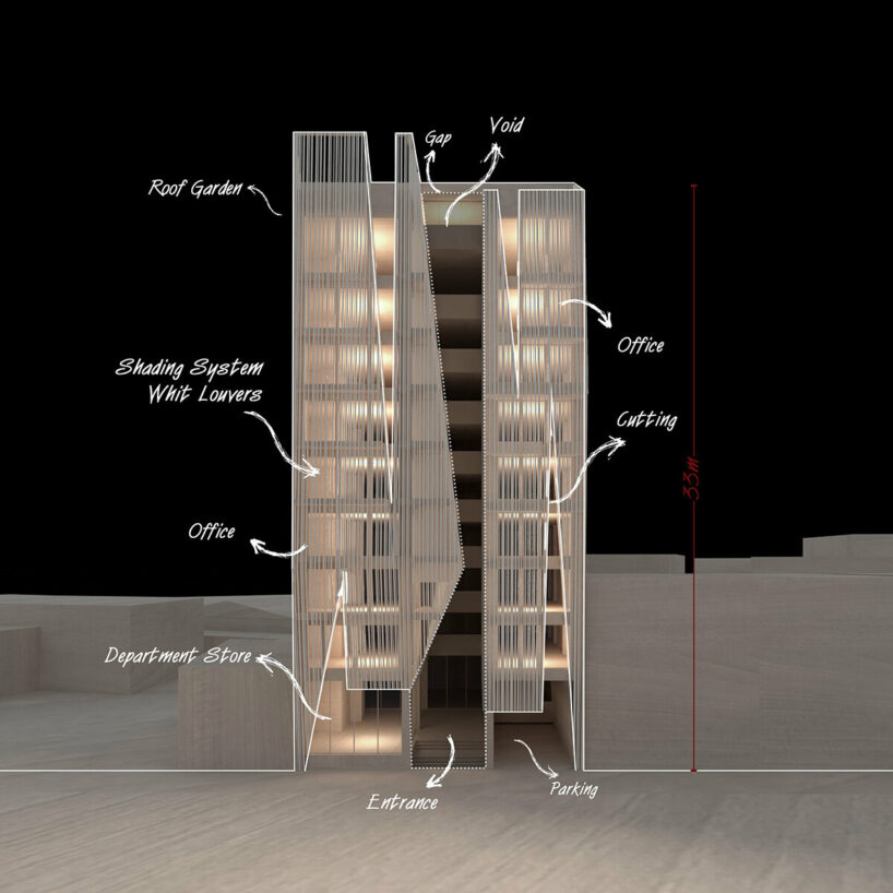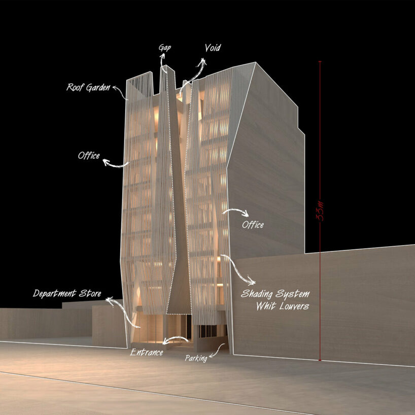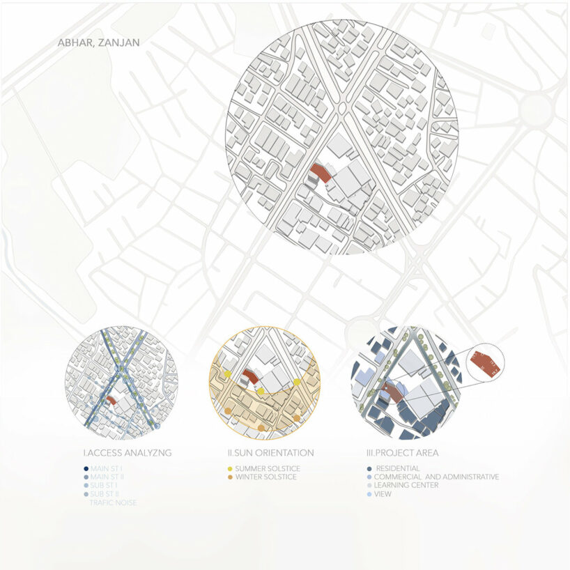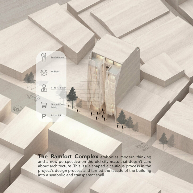the project sits like a ring placed over the terrain, with its funnel-like roof forming a shaded perimeter walkway and an introverted core.