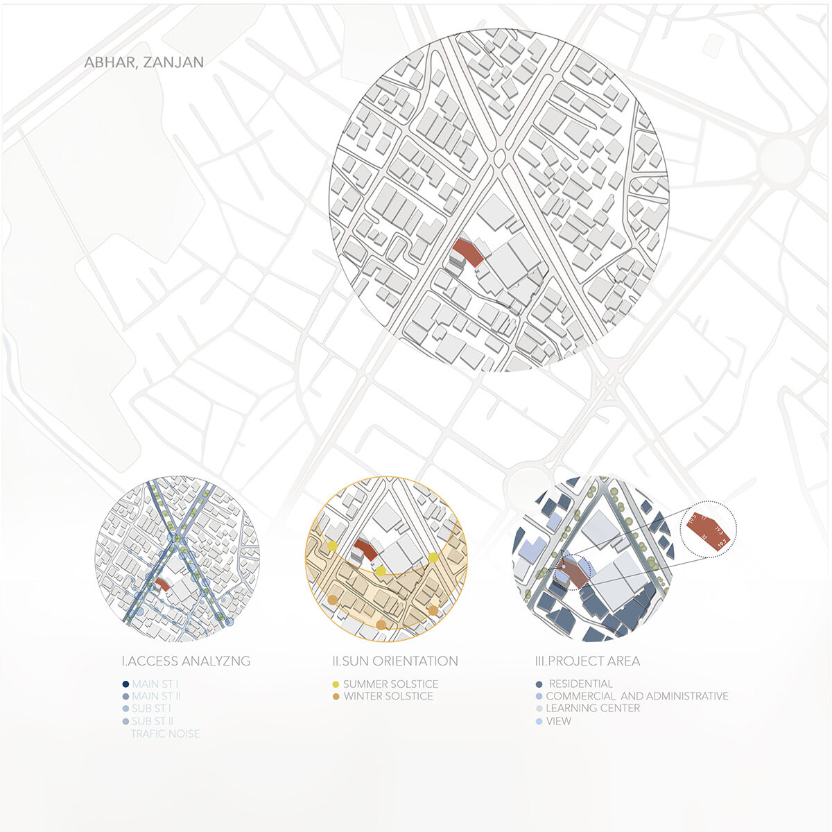 the project sits like a ring placed over the terrain, with its funnel-like roof forming a shaded perimeter walkway and an introverted core.