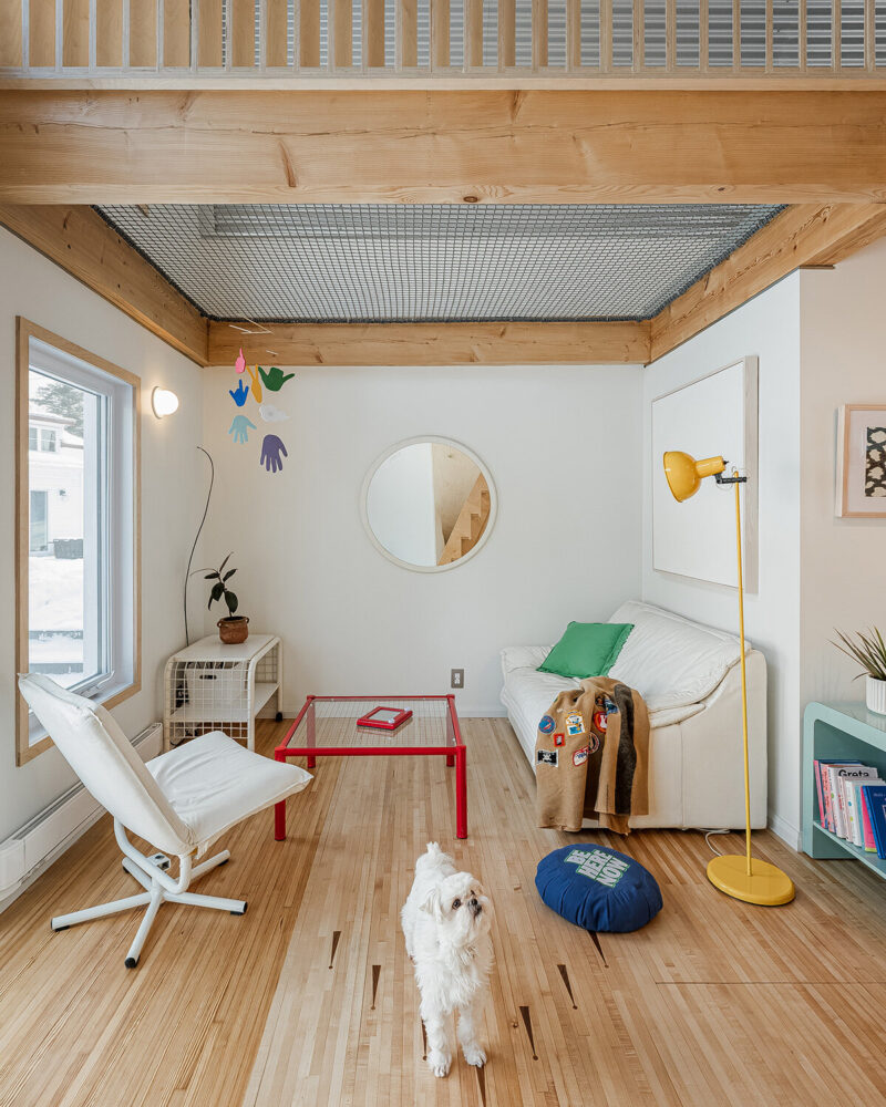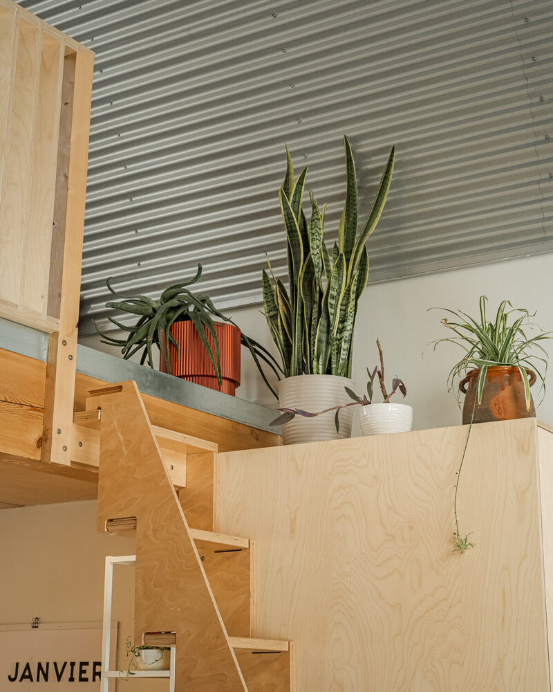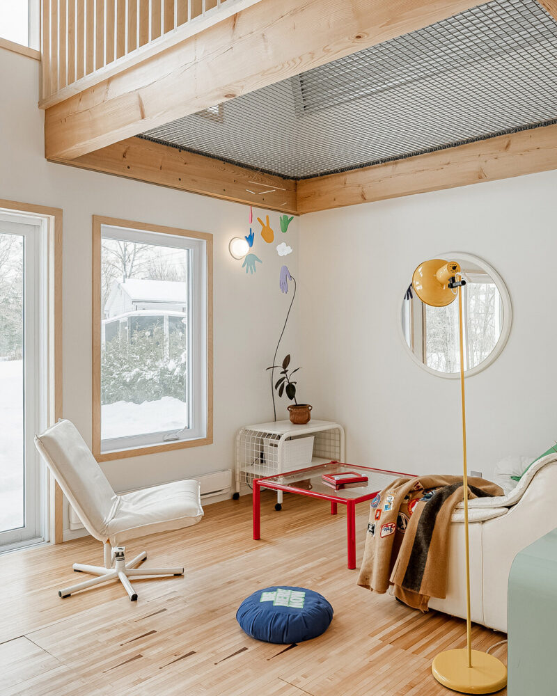 The mezzanine is reserved for rest, with a netted area that hovers near the upper windows. ‘Being in the net feels like a bird’s nest of sorts,she notes,you’re perched up in the canopy of the black walnut tree that can be seen from the three upper windows.
