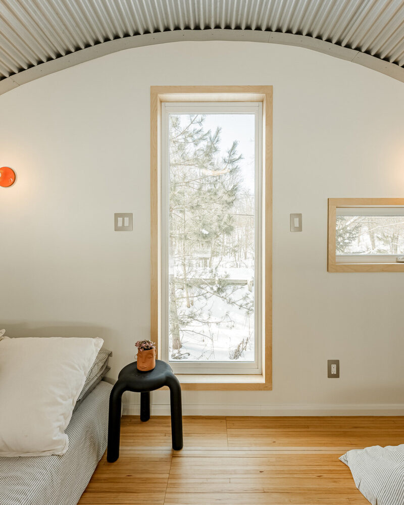 Designer Teedah Hammer, founder of Quebec-based studio Hammer&Son, organizes the Hanger’s interior so that its full height and curved structure would be expressed. It is designed in section as much as in plan. Upon entry, the kitchen, dining area, and bathroom sit beneath a mezzanine and form a compressed zone that contrasts the full height of the living space. From there, sliding doors lead directly to the patio, extending the interior outward.