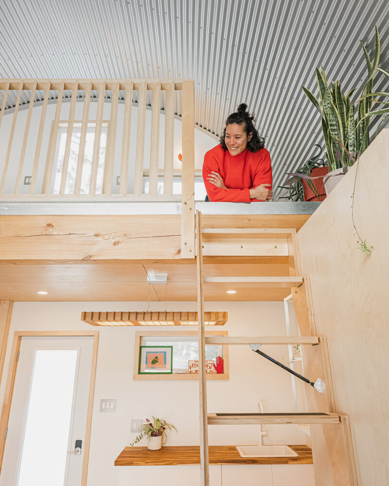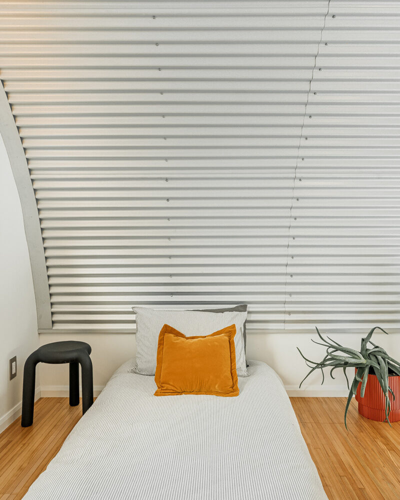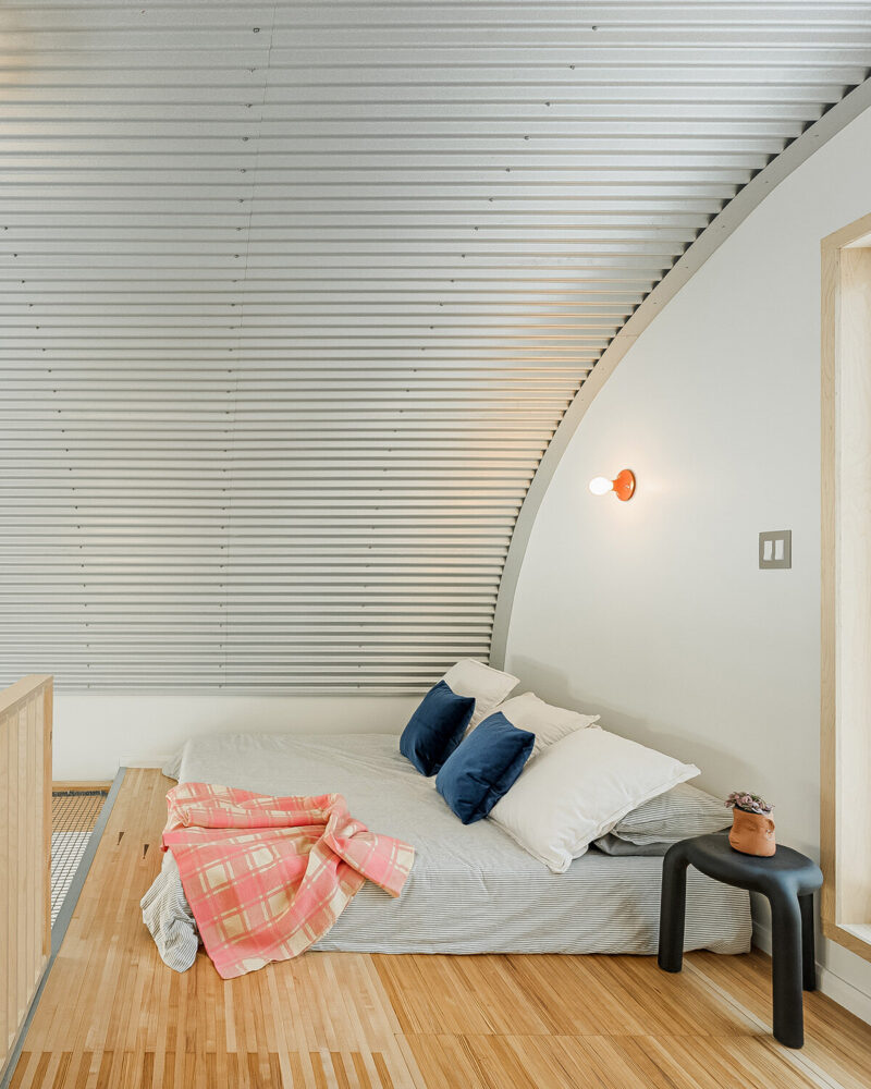 the curved steel shell creates a tall interior volume within a small footprint