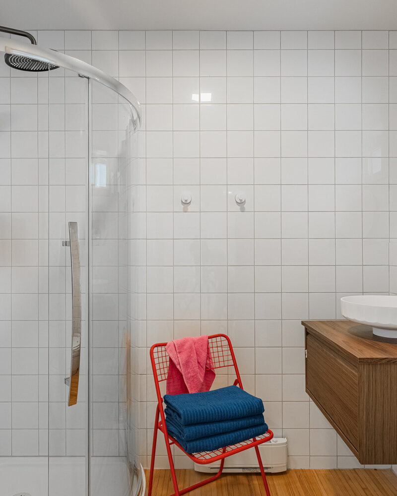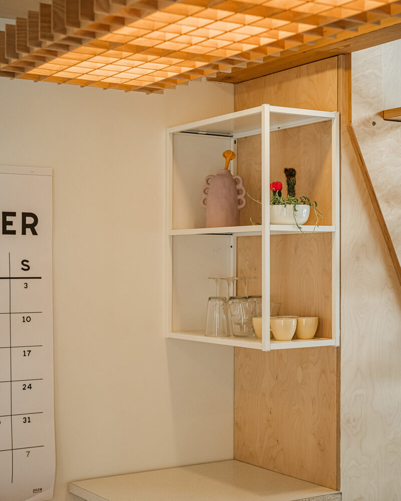 The interior foundation is quite neutral with all the natural materials and white cabinets,She explains.distinctive colour pops and interesting shapes from the vintage post-modern furniture and locally produced art brought that element of fun to the space.