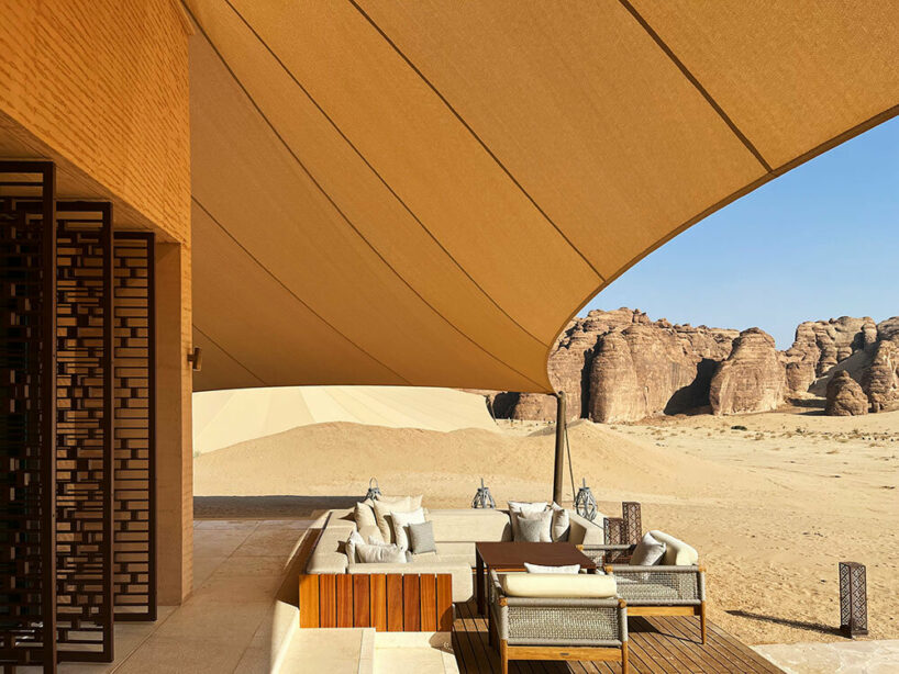 the project sits like a ring placed over the terrain, with its funnel-like roof forming a shaded perimeter walkway and an introverted core.