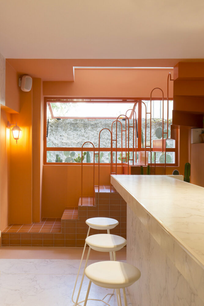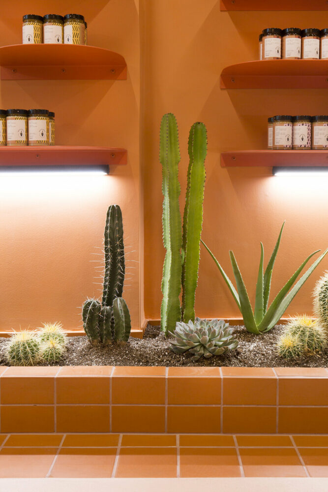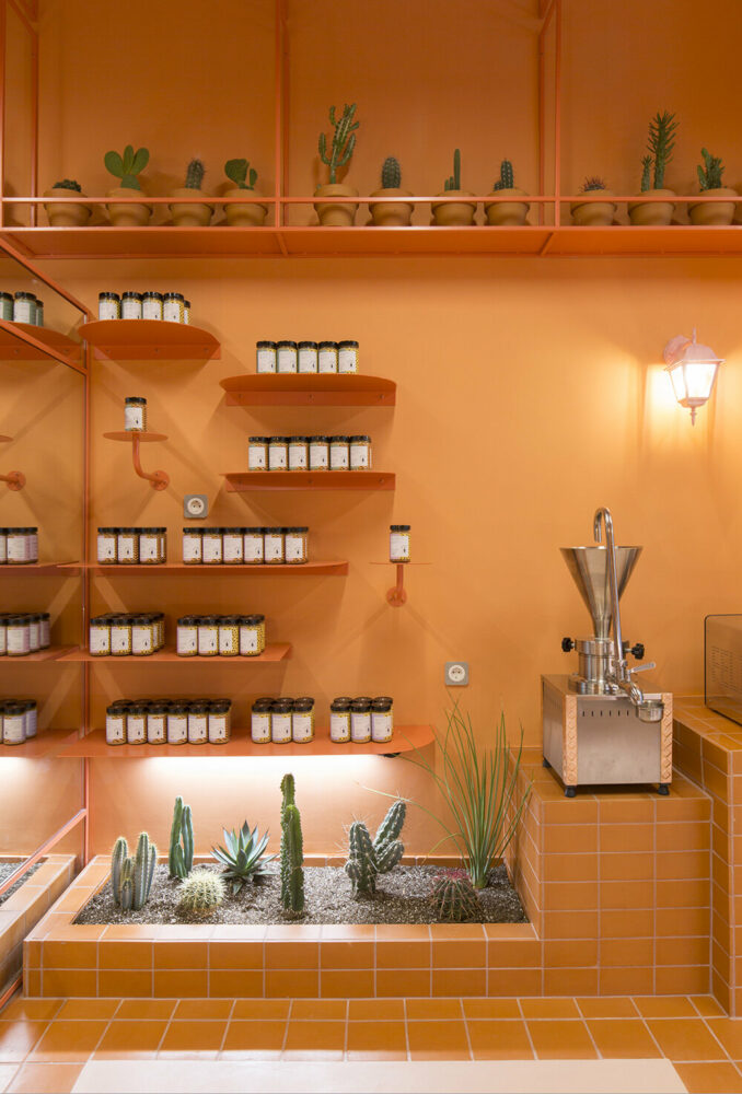 Greek architecture practice Studiomateriality completes a new store design dubbed Wild Souls in one of Athens‘ oldest neighborhoods, right along Voulis street. Inspired by the unprocessed, pure and plant-based food, vegetables, and nuts that the brand has to offer, the two-floor retail space catches the eye and feels truly eye-candy for one’s Instagram feed. Upon entering Wild Souls, visitors take in the monochromatic and terracotta-orange paint applied across the dropped ceiling, splashback, cabinetry, and kitchen island across the shop. Meanwhile, cactus plants decorate the shelves and color-block with the earthy surfaces.