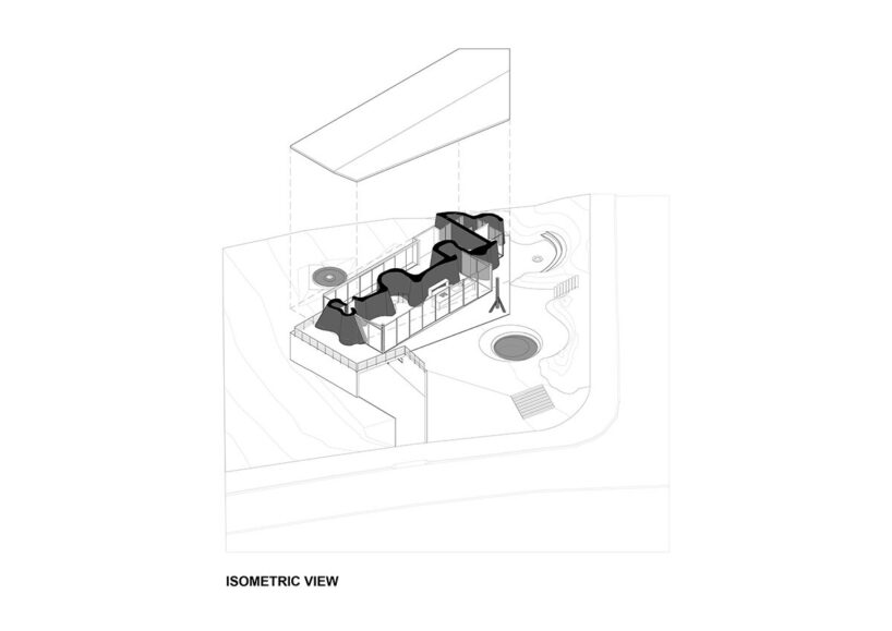 the project sits like a ring placed over the terrain, with its funnel-like roof forming a shaded perimeter walkway and an introverted core.