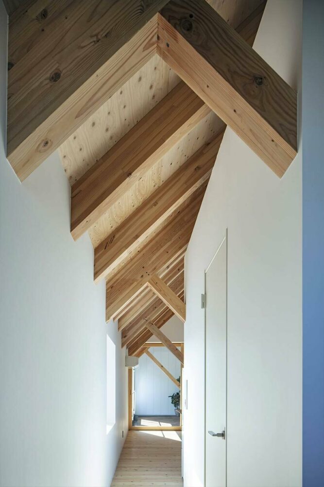 For the clinic project, Tetsuo Yamaji Architects did not limit themselves to conventional solutions but offered an out-of-the-box proposal. ‘I would be happy if the patient who came for dental treatment were as calm and comfortable as possible,’ shares the team. The scheme accommodates a ground floor and a mezzanine, maintaining a visual connection between them. A high ceiling is achieved through a skeleton that utilizes wooden diagonal stilts and a series of wooden beams that support the roof at a slope of 45 degrees. The examination room features wide openings that enable the patients on the dental chairs to gaze outwards. A white corrugated wall ensures their privacy from passers-by but still lets sunlight come in.