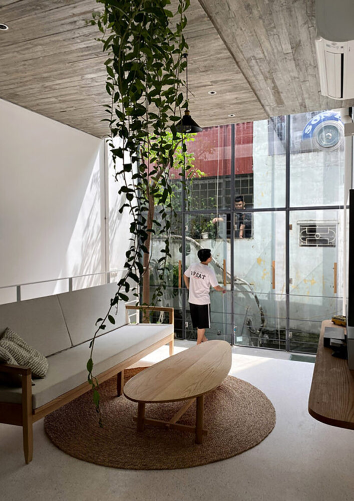 in response to the current density of the area, the team at ODDO architects integrated features that increase breathability, flow, and spaciousness within the TH house. first, the 1.5-meter wide entrance door is counterbalanced by an all-glass northern façade that lets natural light flood the interiors. similarly, the difference in ceiling heights communicate a sense of enlargement and versatility within a tight, 124sqm space. plant life finally weaves its way across the building to improve the microclimate, as well as offer respite from the hectic daily life.