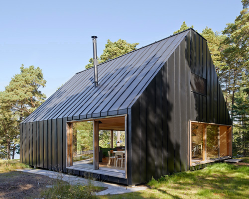 placed in a clearing on the outer stockholm archipelago, swedish practice tham & videgård arkitekter has designed a family holiday home that unifies the site’s previously existing disparate structures. ‘house husarö’ is clad entirely with folded black sheet metal, shaped in response to the plot’s lighting conditions and potential sightlines towards the adjacent sea.